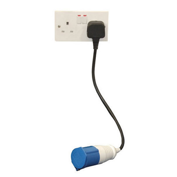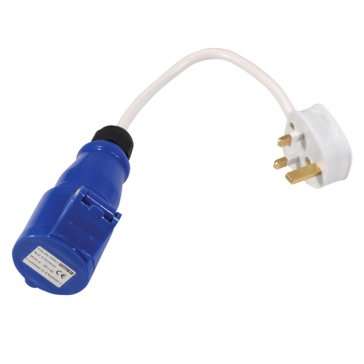 High current mains socket to a single 13 A plug. The product features durable connectors and white cable.