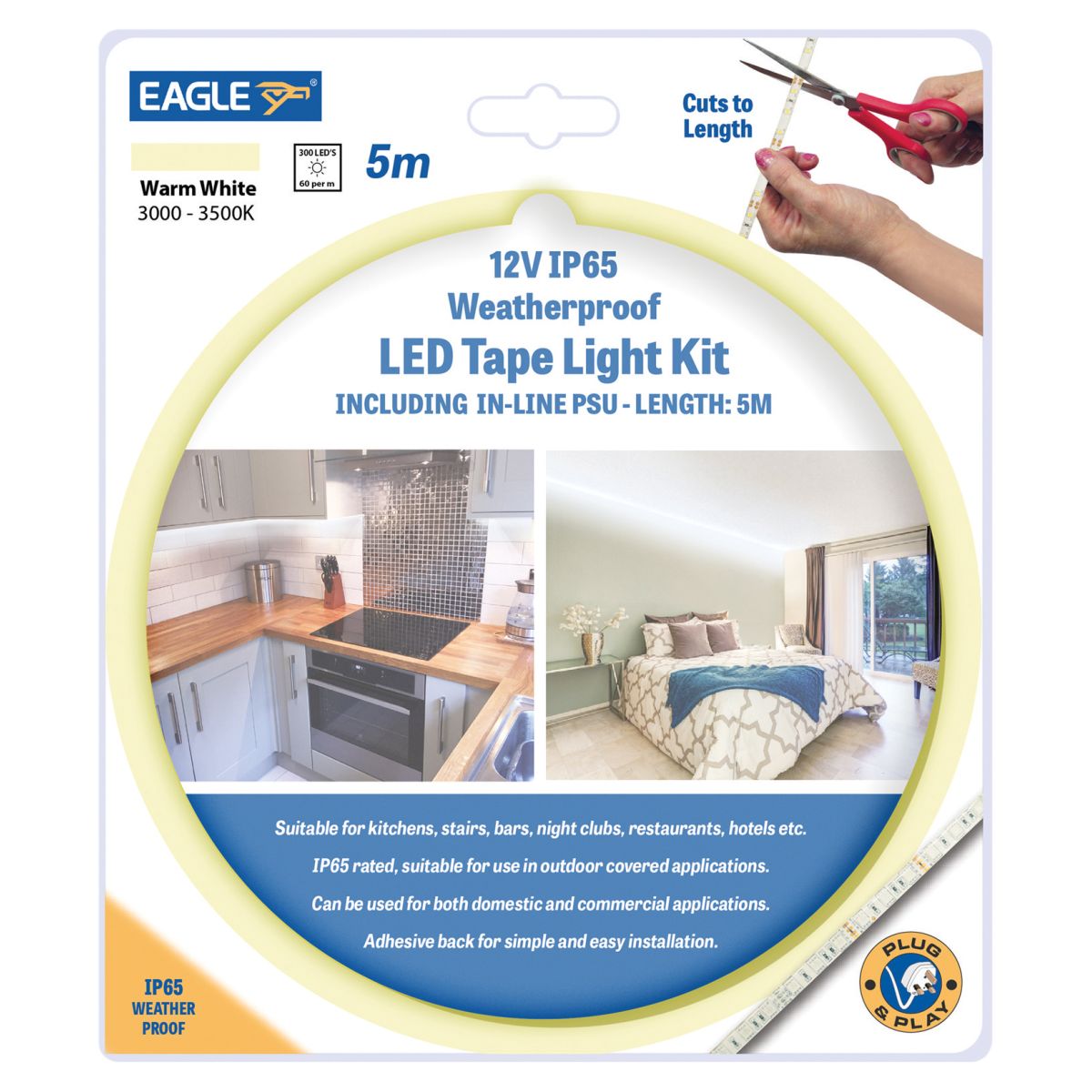 High Quality Plug and Play IP65 rated LED tape light with 60 LEDs per metre. Covered in epoxy resin to protect the LED s the depth is just 2.5 mm and at 8 mm wide the tape will fit easily into many locations. Supplied on a 5 metre reel with a self-adhesive back, this tape is easily applied to most smooth surfaces by simply removing the backing paper. The tape can be easily cut or joined, with cutting points at every 3rd LED (5 cm) intervals. Highly flexible and versatile with a low power consumption the tape is ideal for many uses such as decorative lighting in homes, vehicles, shops, bars, nightclubs. As the tape itself (only) is waterproof it is ideal for use in kitchens and covered outdoor applications. Included in the kit is a (12V) In Line Power Supply.
