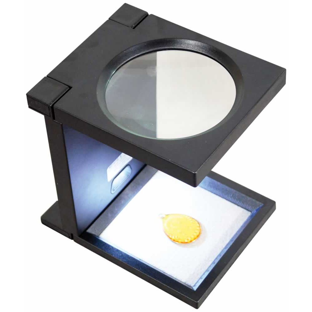A hands free 110mm lens with 2.5 x magnification, this magnifier is based on the original linen tester style magnifier. Fitted with 2 x LED lights to offer brightness when in use. This magnifier requires 3 x AAA batteries (not supplied) and is easily workable with an on/off switch. The edges are fitted with ruling edges of up to 10cm or 4 inches, which can be useful for working on a range of projects. The free standing design makes it a sturdy option when mounted on a steady surface such as a table top. Another helpful feature of this magnifier is that it is foldable to pocket size.