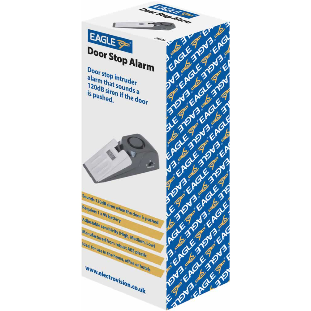 The Eagle door stop alarm is powered by 1 x 9V (PP3) battery (Not Supplied) and will sound a Powerful 120dB alarm / siren if the door is pushed. The movement sensitivity can be adjusted (High, Medium, Low) using a simple slide switch. The door stop alarm is manufactured from robust ABS plastic and provides mobile security making it ideal for use in the home, office and hotels to give extra peace of mind.