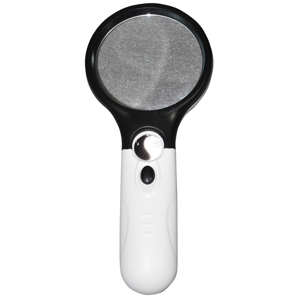 This 3 in 1 LED Handheld Magnifier is a great accessory for hobbyists, children and adults alike, ideal for a wide range of applications including reading. The LED light offers the user a clearer view. Comes with a comfortable handle for ease of use. Supplied with a built in jewellers loupe. Uses 3X (large lens) + 45X (small lens) magnification.
