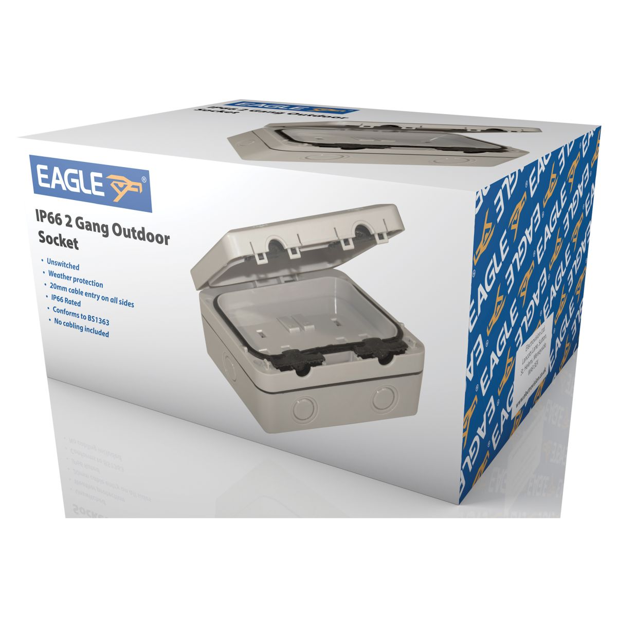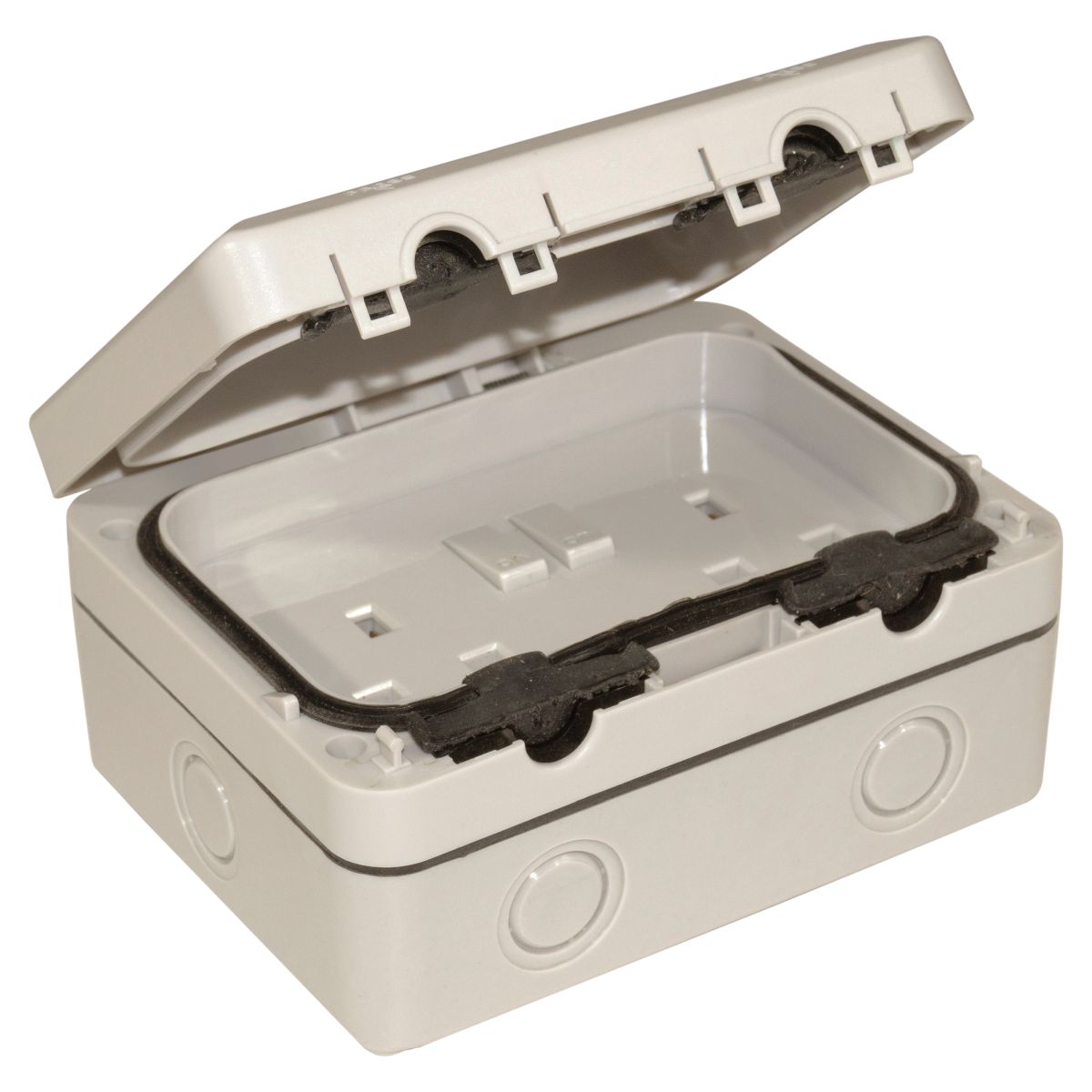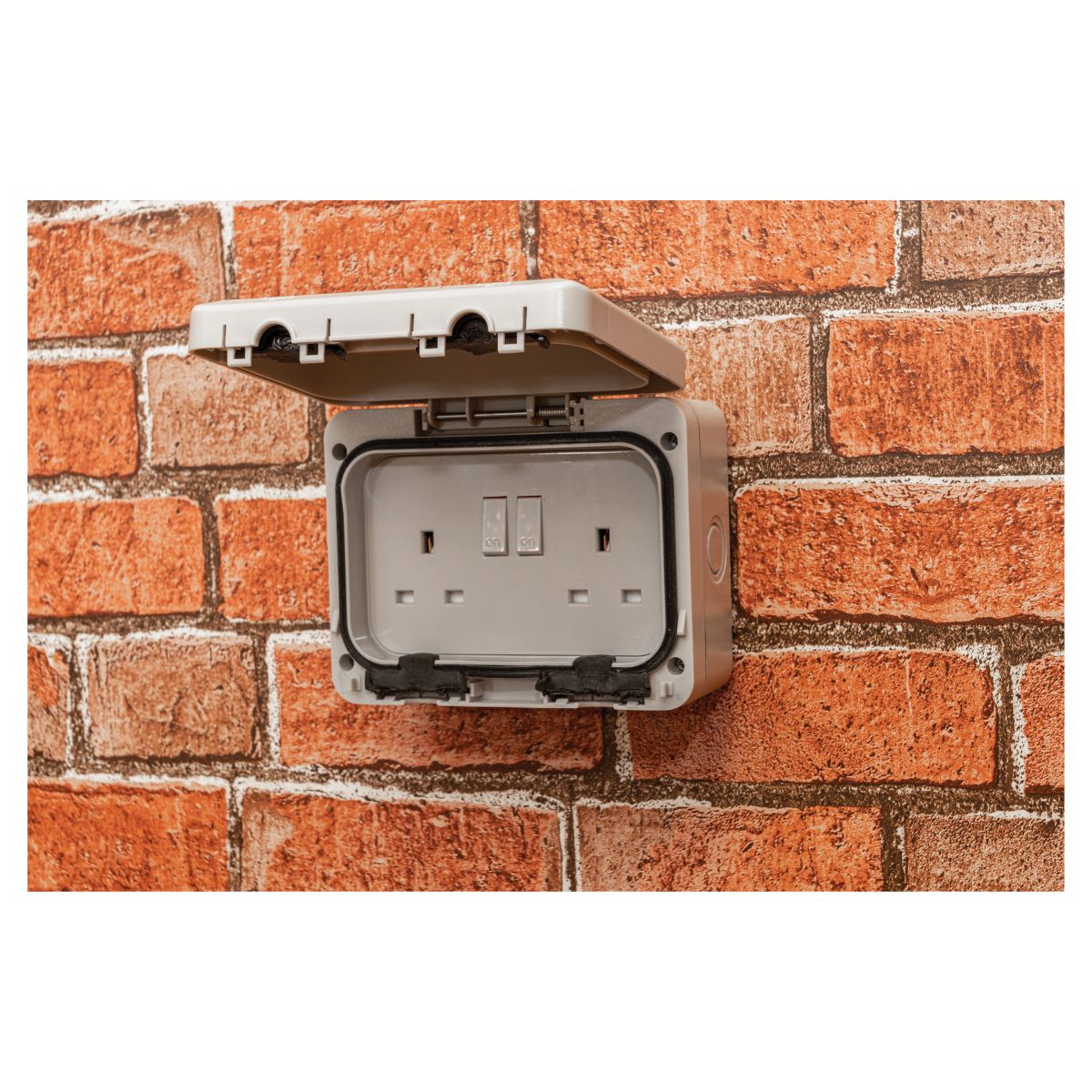 Weather Resistant 2-Gang Switched Outdoor Socket 13A. Ideal for gardens, factories and industrial premises. The IP66 rated enclosure gives a high level of protection against ingress from weather, water jets and dust, enabling the safe operation of connected items. Consult the help of a professional prior to installation . Switched IP 66 Weather protection 20mm cable entry on all sides Rugged High Impact Resistance Moulded Housing
