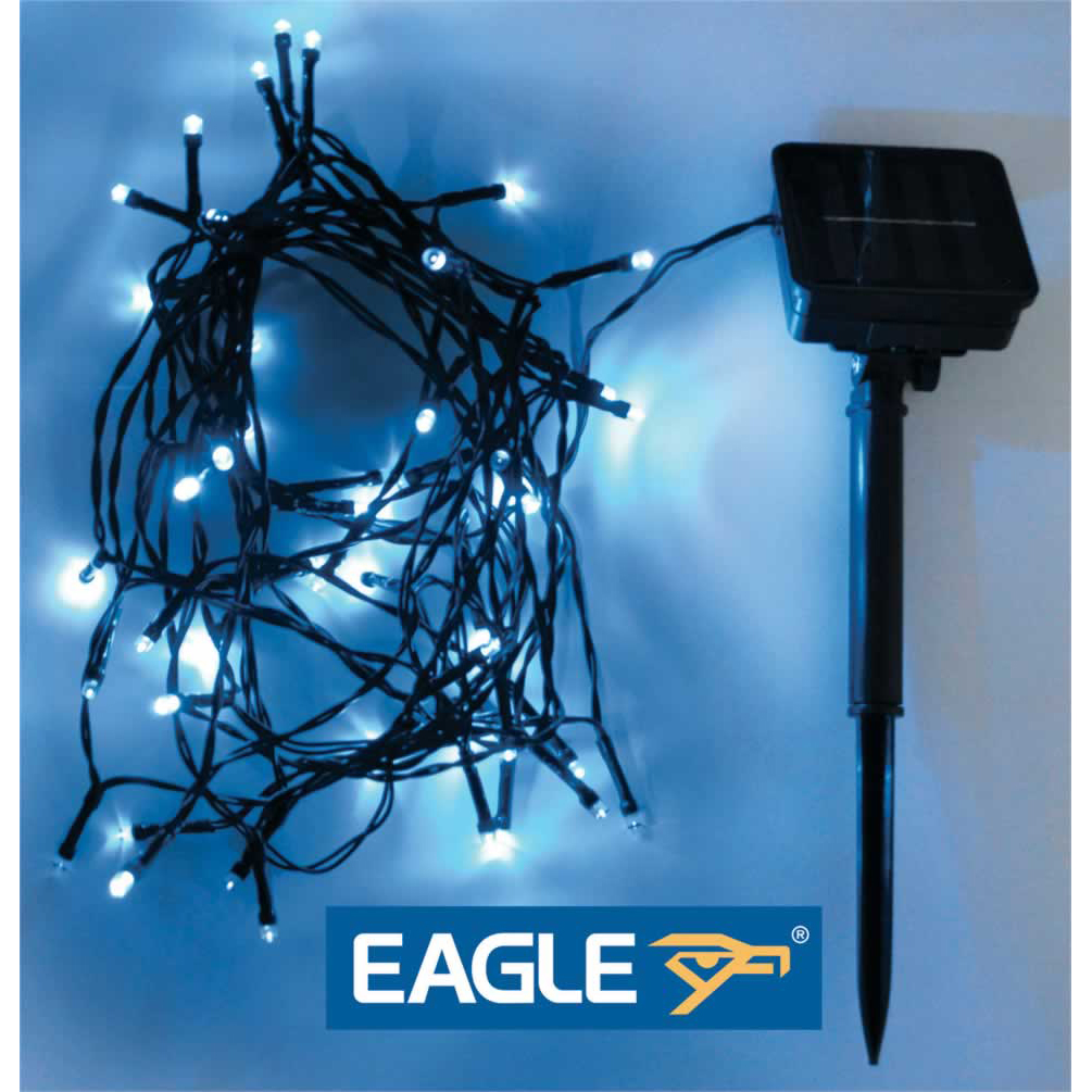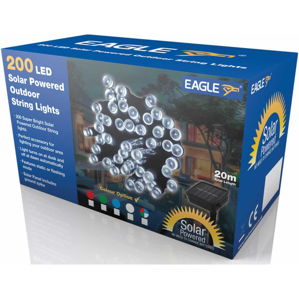 These Eagle LED Solar Powered outdoor String Lights are the perfect accessory for lighting your outdoor area. The lights are supplied with a plastic spike which can be securely inserted into the ground and hold the solar panel to obtain and store the suns energy which will provide power to the LED Lights. These LED Solar Powered lights will automatically turn on at dusk and with the option of 2 modes you can choose the LED?s to be static or flashing the choice is yours!