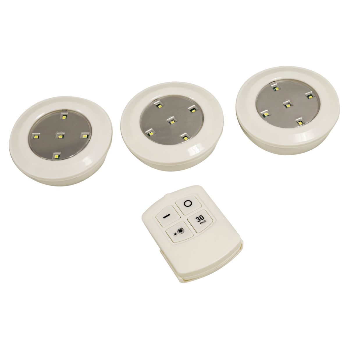 This pack of 3 Eagle push lights are multi-functional and wireless which allows easy and simple installation, these lights are ultra-bright and can be affixed to most surfaces with the adhesive tape (included). To operate they can be switched on/off by the remote control or with a simple one-touch push, they also feature a dimming function and a 30 minute timer. The LED Lights are battery powered and require (3 x AA batteries) and the controller requires (2 x AAA batteries) (batteries not supplied).