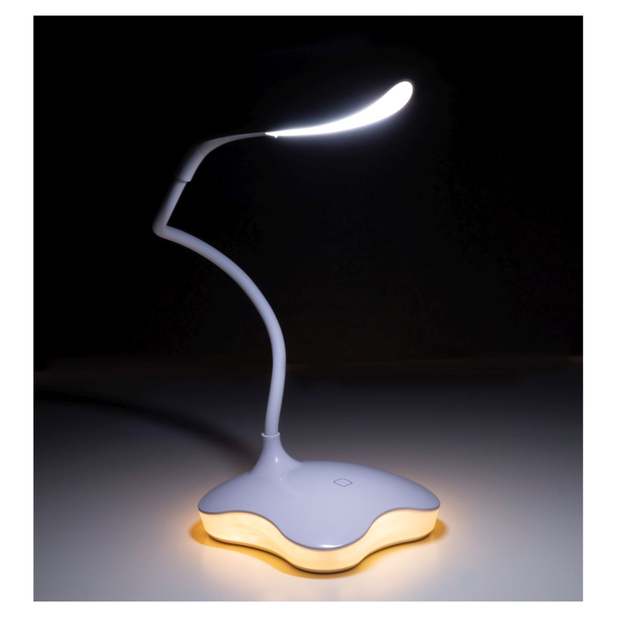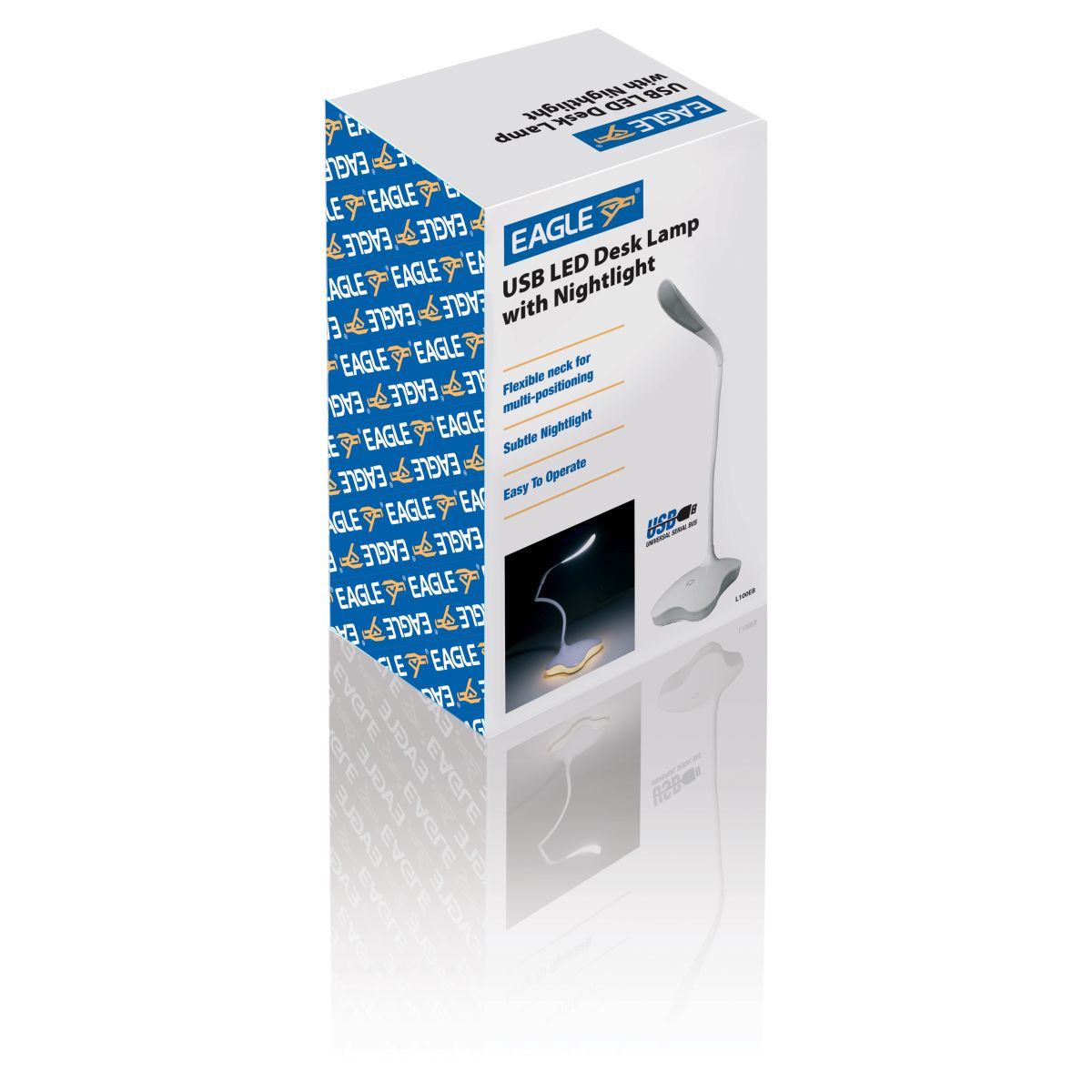 The Eagle USB LED Desk Lamp features a subtle nightlight, the lamp can be powered by battery (4xAAA not included) or USB. The long flexible neck allows multi-positioning to suit each user. Operated with a One Touch function which allows for easy control of the 3 brightness settings.