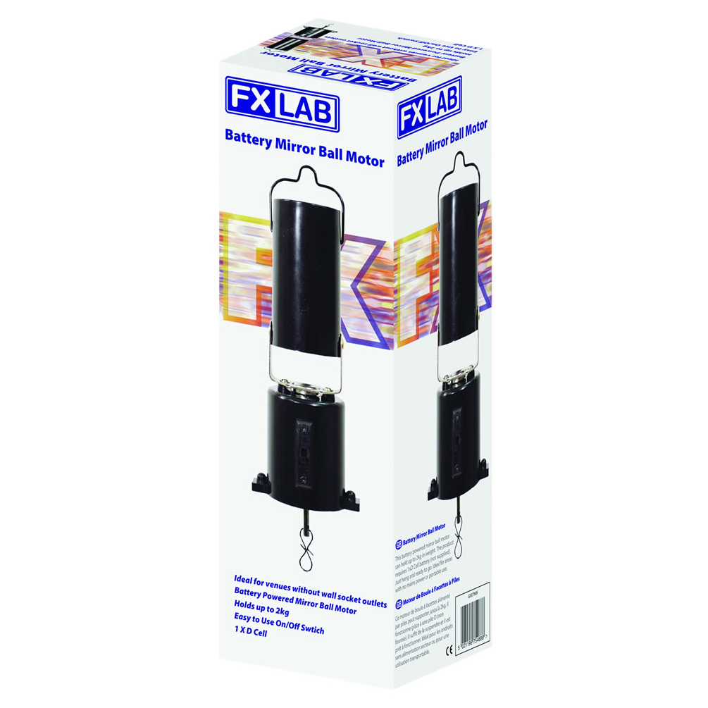 This FXLAB battery powered mirror ball motor can hold up to 2kg in weight. The product requires 1xD Cell battery (not supplied). Just hang and you are ready to go. Ideal for areas that have no mains power or for portable use.