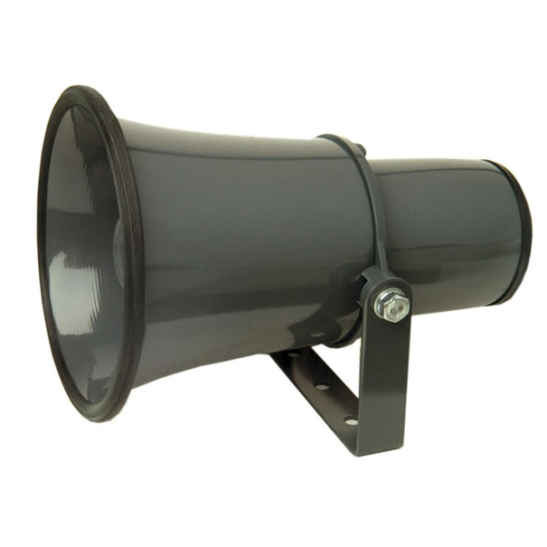 Economical round horn speaker with internal 100 volt line transformer. The horn features Wattage tapings selected by connecting signal cable to screw terminals inside rear cover and adjustable metal bracket for wall or ceiling mounting.