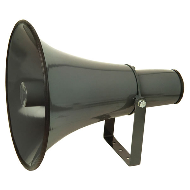 Economical round horn speaker with internal 100 volt line transformer. The horn features Wattage tapings selected by connecting signal cable to screw terminals inside rear cover and adjustable metal bracket for wall or ceiling mounting.