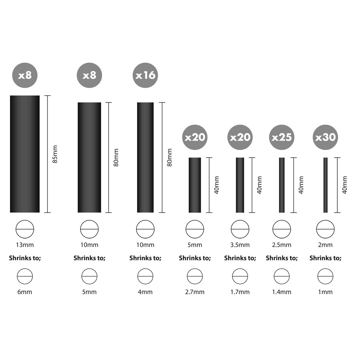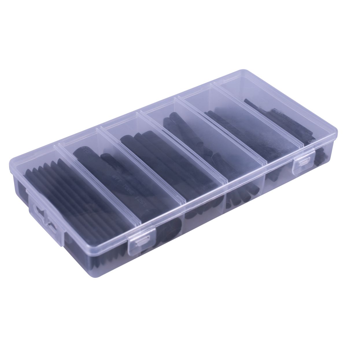 A heat shrink tubing set consisting of 127 pieces of tubing in various lengths and diameters. Heat shrink tubing is a shrinkable plastic tube used to insulate wires, providing abrasion resistance and environmental protection for stranded and solid wire conductors, connections, joints and terminals in electrical work. Heat shrink tubing can help ensure the continued performance of wiring and cables. Insulation of electrical wires and cables is first and foremost required to prevent electrical shock. However, the insulation of wires and cables also prevents the loss and dissipation of energy being conducted through the wiring. Supplied in a handy plastic storage box.