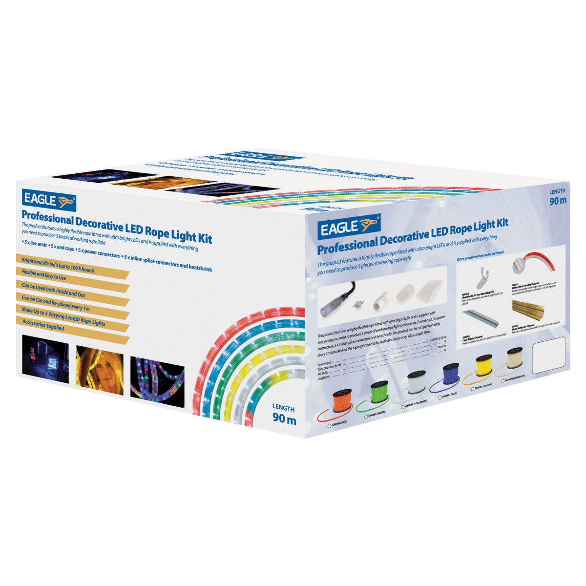 A highly flexible and robust decorative rope lighting product supplied with a set of comprehensive wiring accessories allowing up to 10 separate rope lights to be assembled. The product features ultra bright LEDs producing intense vibrant colours, highly flexible tube allowing complex designs and shapes, simple and quick to make up and install with a large operational temperature range of between -20C to + 60C. The product is supplied with 10 x 2m live ends, 10 x end caps, 10 x power connectors, 10 x inline splice connectors, heat shrink and glue. The product can be cut approximately every 1m (marked on the rope light) and is for professional use only.