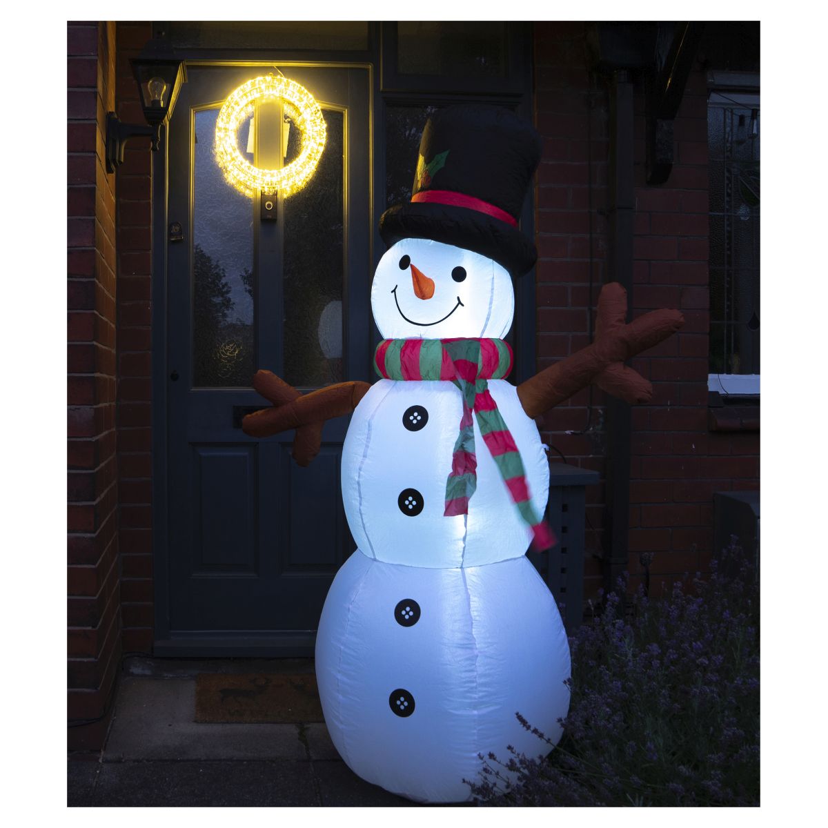 Delight your family and neighbours this festive season with the charming 180cm inflatable Snowman from St Helens Home & Garden. Everything you need is supplied, simply plug him in and watch him inflate, it couldn't be easier. The Snowman features internal pre-assembled LED lights to make Christmas that little bit more magical. Supplied with an internal fan, 12V power adaptor, safety ropes and 2 pegs to help anchor it to the ground in inclement weather, the base is also weighted for extra safety, a zip compartment allows you to add extra weight if necessary. When the sad day arrives and Christmas is over simply fold him flat and pack him away in his box until next year. Made from 100% polyester. For either indoor or outdoor use.