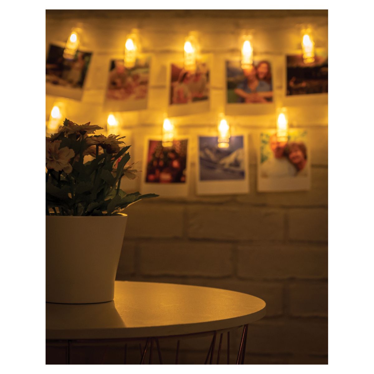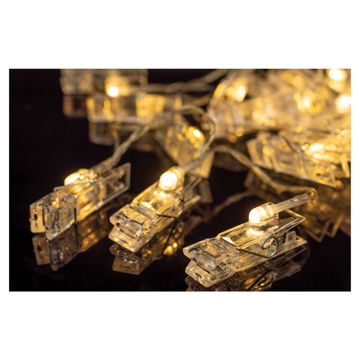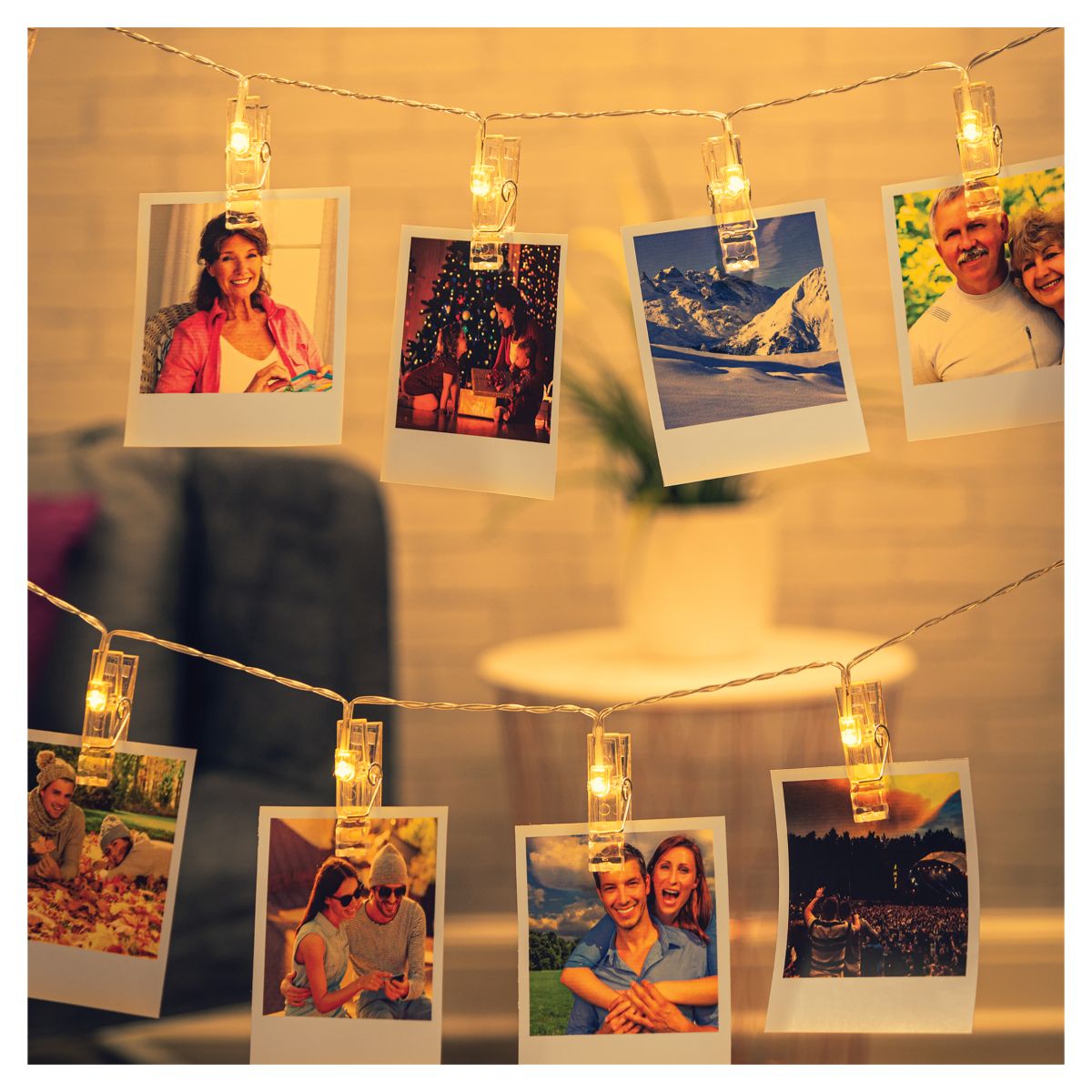 These stunning LED Clip Lights are the perfect decorative accessory, they are ideal for use in the home, at christmas, weddings or special events, display up to 20 cards, photos or images by simply attaching them to the clips, each clip houses a warm white LED which emanates a soft glow and highlights your photo or picture .The string lights are 2m in total length. Powered by 3 x AA Batteries (not included).