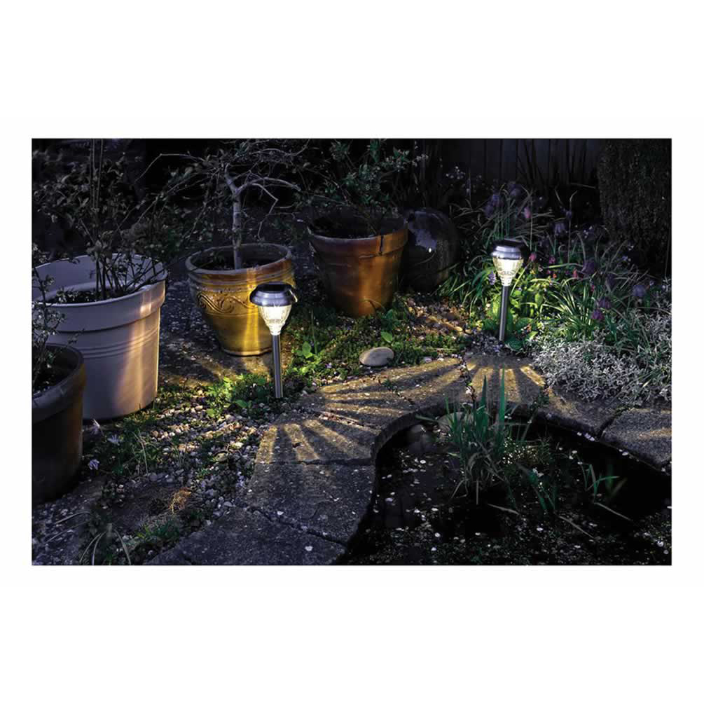 Decorate your outdoor living space even in remote areas by placing these stylish lights in a sunny spot, they will enhance the look and feel of any garden. This solar light is made from durable stainless steel and can also be used to provide ambient light sufficient to illuminate paths, borders and driveways etc. The light has an on/off switch and an integral solar panel.