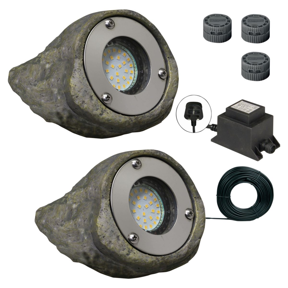 These 12V rocklights are suitable for illuminating statues, water features, bushes and trees. This product is supplied as a kit, comprising of two rocklights, transformer and 10 metre SPT1 cable. The lights are made of a Polyresin which is a combination of natural stone and resin. This mixture creates a surface that is resistant both to weather and algae growth.