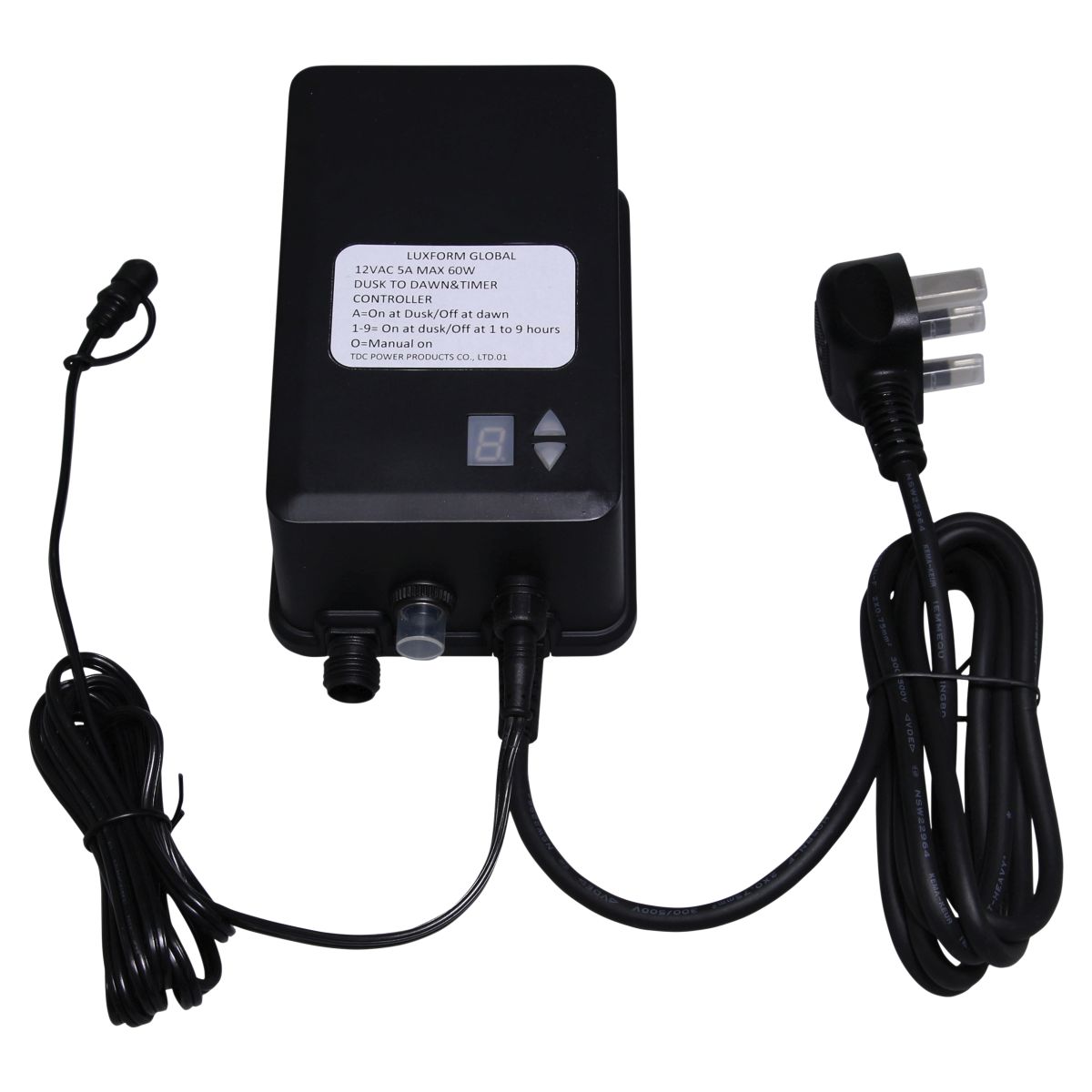 Luxform Lighting 60W transformer with built in On, Off, Auto and 1-9 hour photocell timer and dusk / dawn sensor. Input: 230Vac 50Hz BS moulding plug. Output: 12Vac 60W female plug.