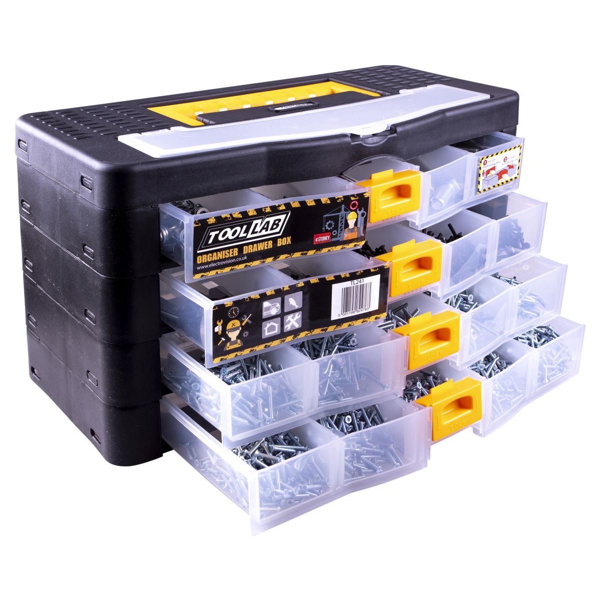 Mobile toolbox, organiser and storage case, perfect for storing small items like washers screws, nails, bolts etc. Pull out drawers with fold up front to keep them in place during transport, a strong carry handle for portability.