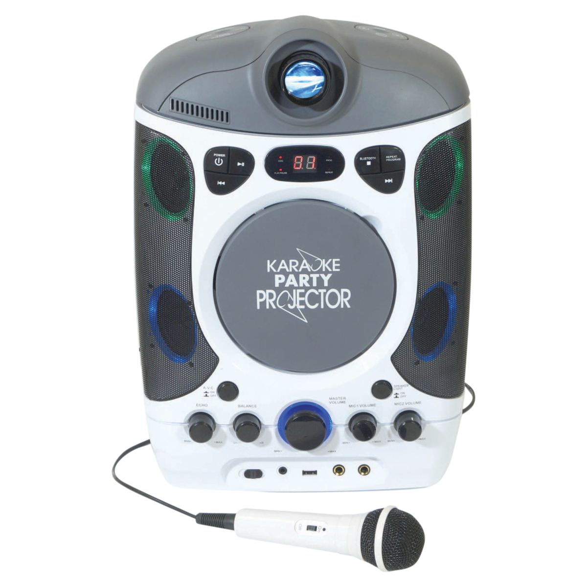 The unit has two front-fitted 6.3 mm jack microphone inputs with volume controls, adjustable echo effect and an AVC function (Automatic Volume Control) which dips the music when you begin singing into the microphone.