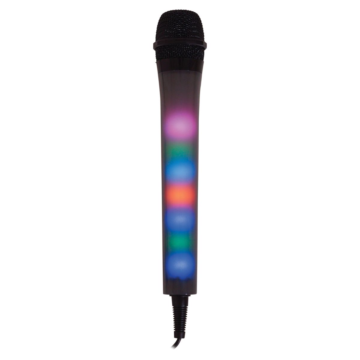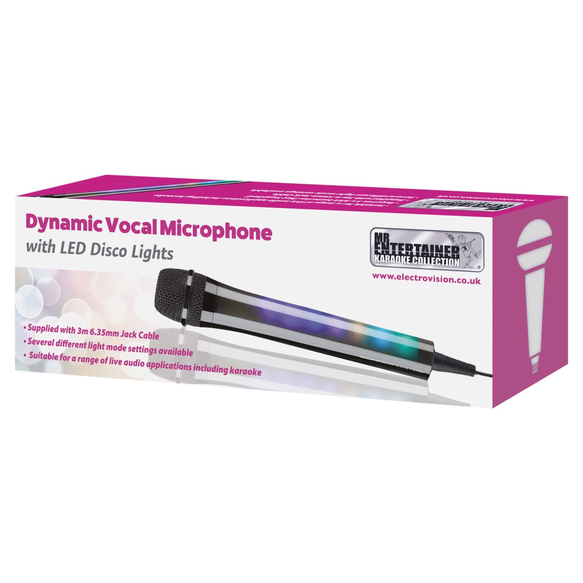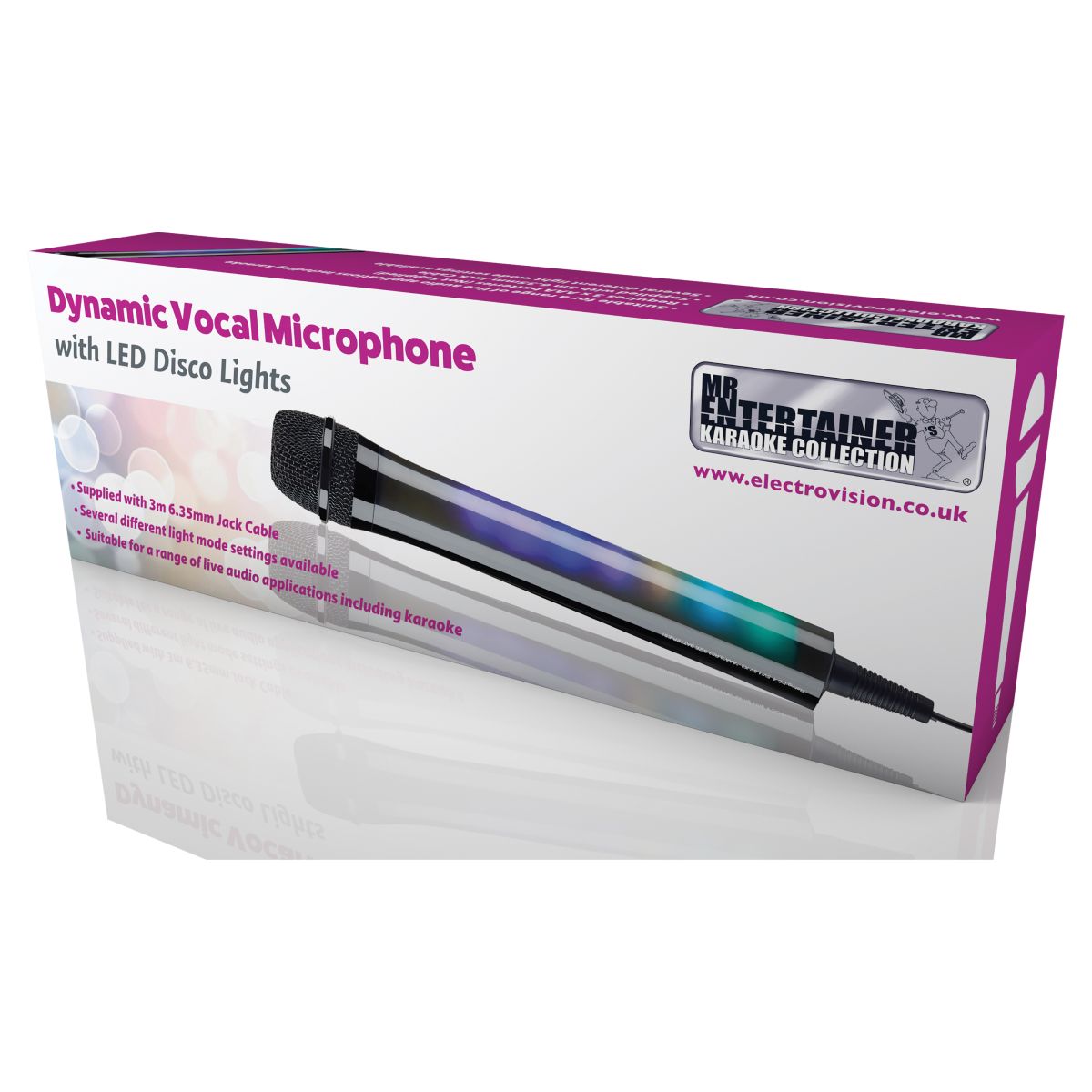 This Mr Entertainer light up microphone is the perfect addition to any karaoke setup, karaoke nights will never be the same again. This unique dynamic handheld microphone has hidden LED s that light at the touch of a button. The seven bright RBG colour changing LEDS chase and change colour in the RANDOM mode or in the MUSIC mode will synchronise to the beat of the music. The microphone has been fitted with a high quality dynamic capsule for clear sound reproduction, an integral on/off switch and a useful anti-roll grill. Available in either black or white with a generous 3m cable you can dance freely around the room. Supplied fitted with a 6.3mm jack plug making it compatible with most karaoke machines or PA amplifiers.