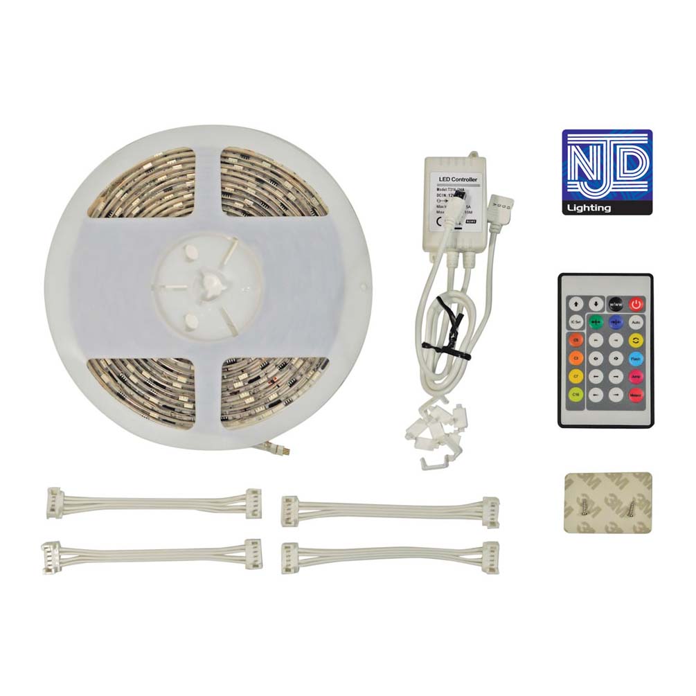 This 5m length of Digital RGB LED tape light has 150 tri-colour LEDs. Each LED changes colour via the Infrared remote control and IR receiver (supplied). With the digital technology built into the mini control box, you can achieve breath-taking colour changing effects such as colour chases, colour waves and colour fading. The IR reciever is on a flexible wire, making it easy to place conveniently with line-of-sight to the remote control. Together, the kit has many adjustable functions, 16 selectable colours and a dimmer feature. The tape itself is 9.7mm wide and 2.8mm in height. Easy to install with the self-adhesive backing, this tape light kit is also supplied with four easy-to-use connecting cables. A suitable power supply is P003Y.