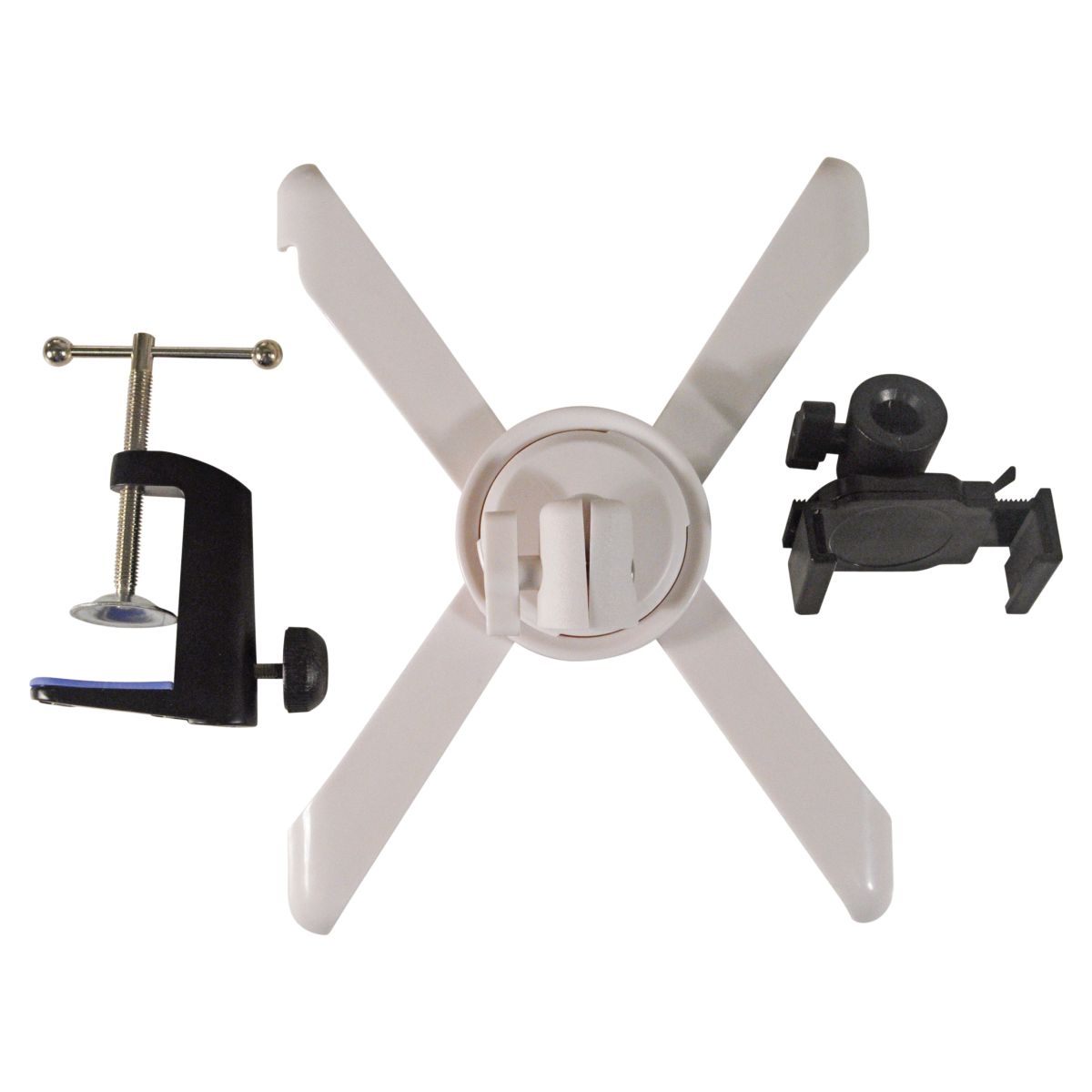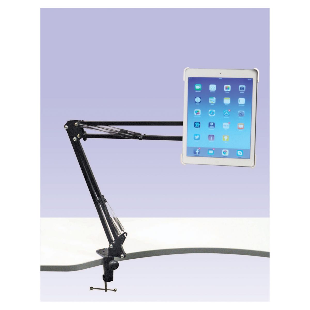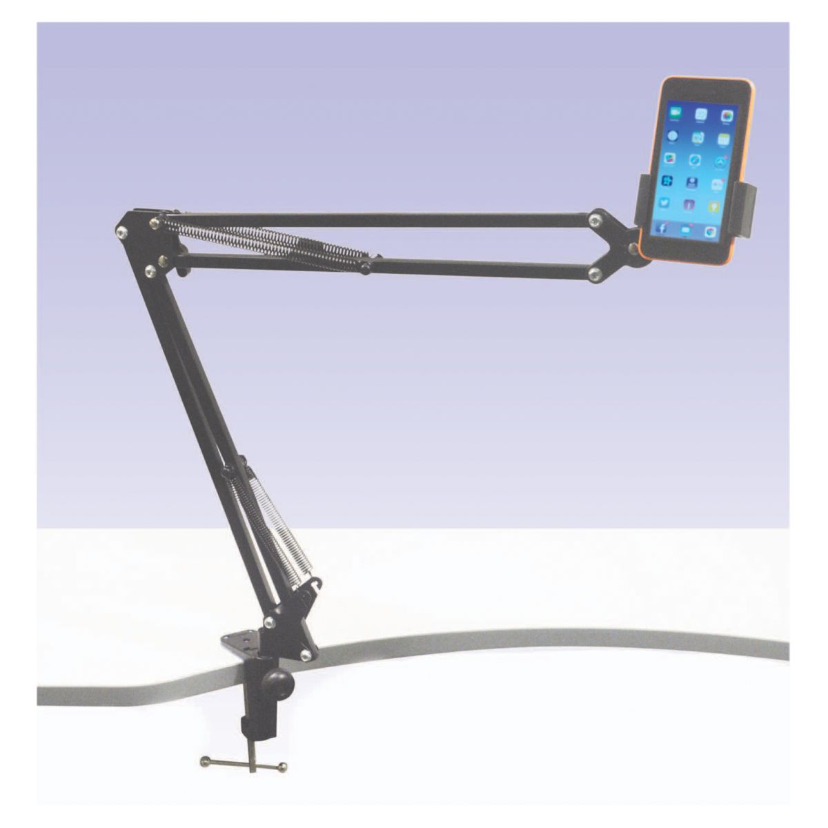 Universal smartphone stand with G Clamp bracket. Suitable for standard iPads (Not Mini or Air Models) and smartphones 54-96mm. The product clamps firmly on to your telephone via the robust adaptors provided and the articulated bracket allows the product to be rotated through 360 degs and also has further adjustment for height, tilt and reach allowing your device to be viewed from just about any position you require. The G clamp bracket mounts onto smooth flat services simply and easily.