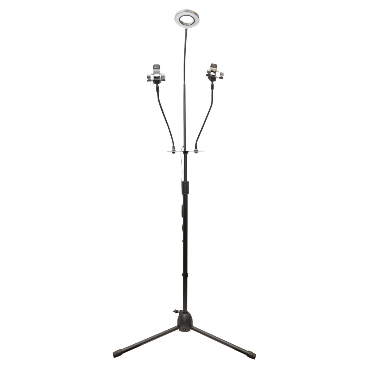 TRIPOD MOUNTED LED RING LIGHT WITH MICROPHONE AND MOBILE PHONE HOLDERS AND STORAGE PLATFORM
