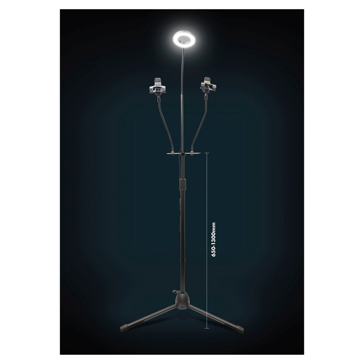 This Tripod Mounted LED Ring Light with Microphone Holder, Mobile Phone Holder and Storage Platform is perfect for recording YouTube and tiktok videos, online tutorials and even taking selfies. The gooseneck LED ring light can be positioned at any angle allowing you to take the perfect shot, the light is 8.8cm in diameter. Smaller items such as sound cards can be safely placed on the handy storage platform whilst you record. A 2m USB cable is attached (to power the light). A remote control for the light is also incorporated. The remote control allows the light to be dimmed through a range of colours, from warm yellow, white and warm white. The tripod stand is height adjustable from a minimum height of 65cm to a maximum height of 130cm. The metal storage platform is 16cm x 15cm.