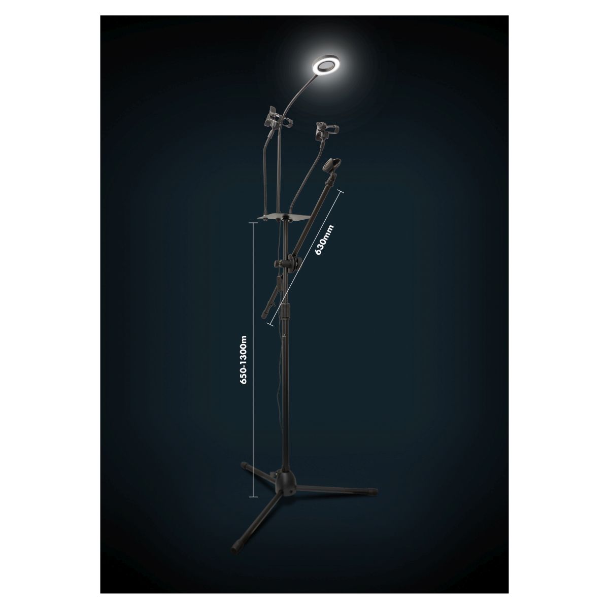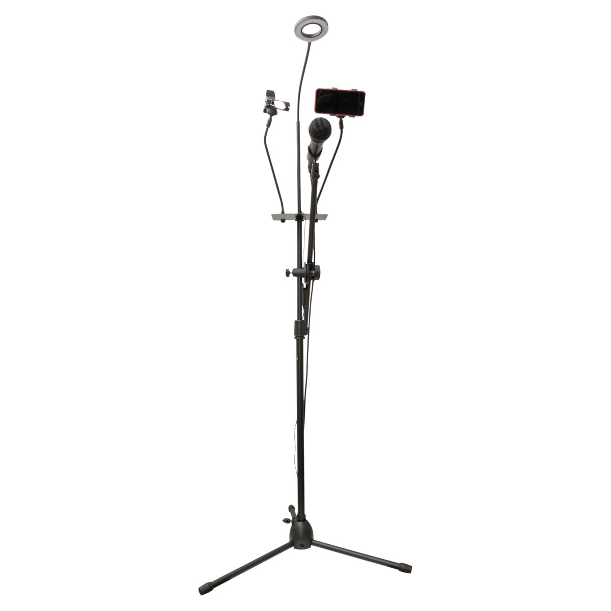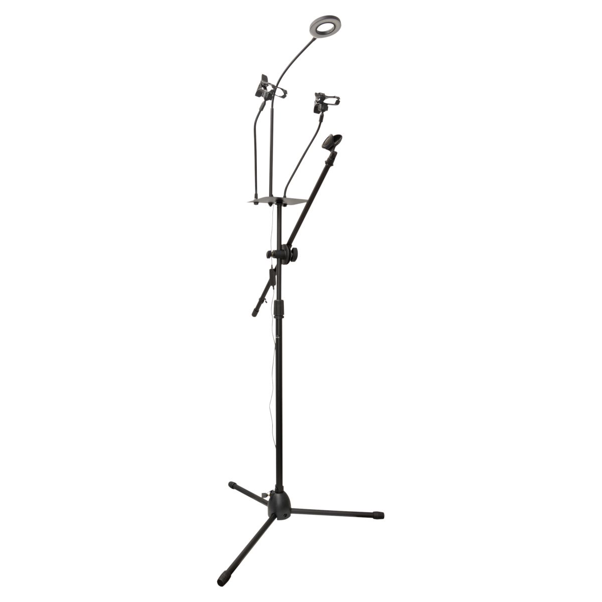 Features 2 mobile phone holders, microphone boom arm and storage platform