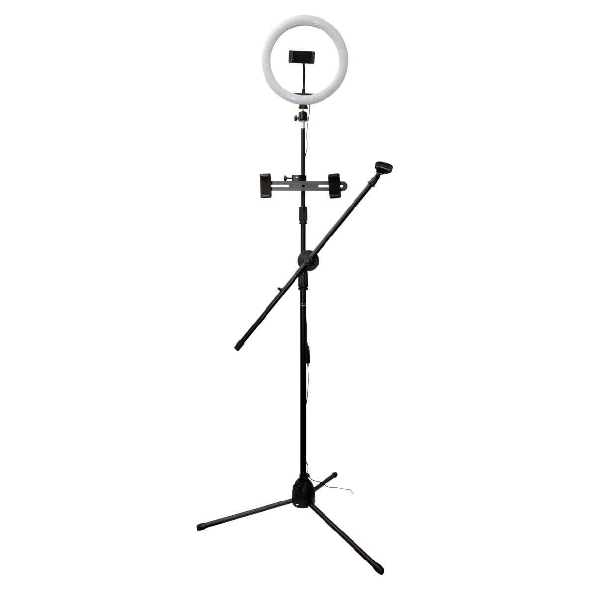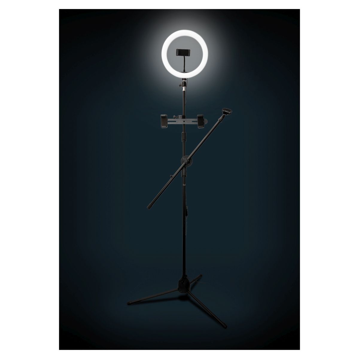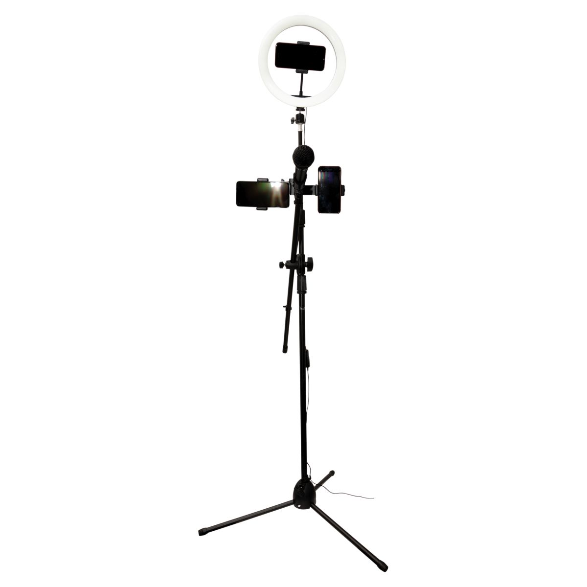 TRIPOD MOUNTED LED RING LIGHT WITH MICROPHONE HOLDER, 3X MOBILE PHONE HOLDERS AND STORAGE PLATFORM