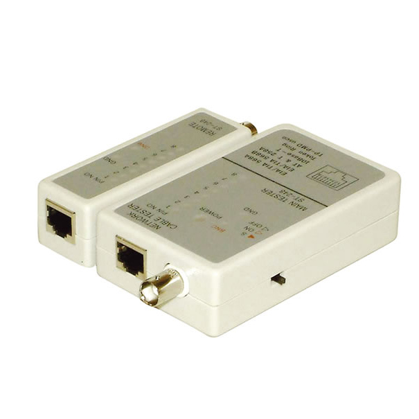 Network cable tester. Capable of testing RJ11, RJ12, RJ45 and BNC cables with both straight and crossed connections.