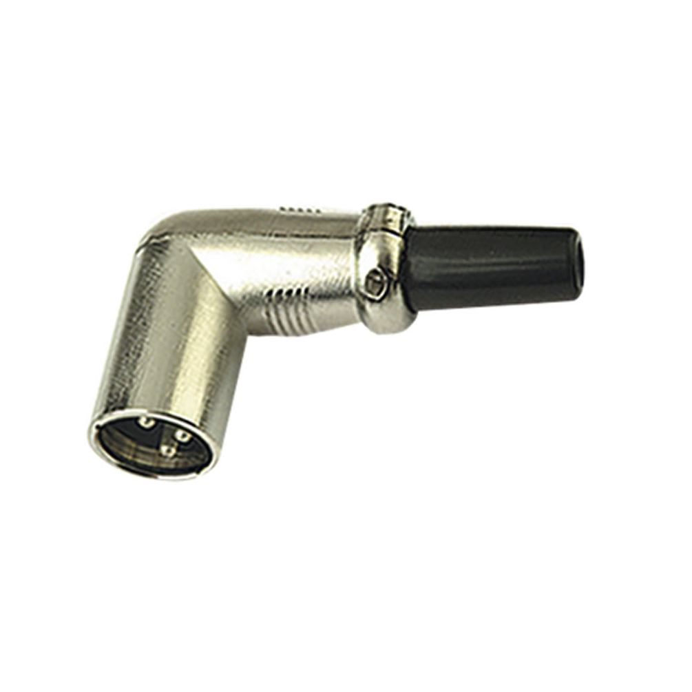 Standard quality, right angled, Nickel coloured metal case with cable protector and solder terminals.