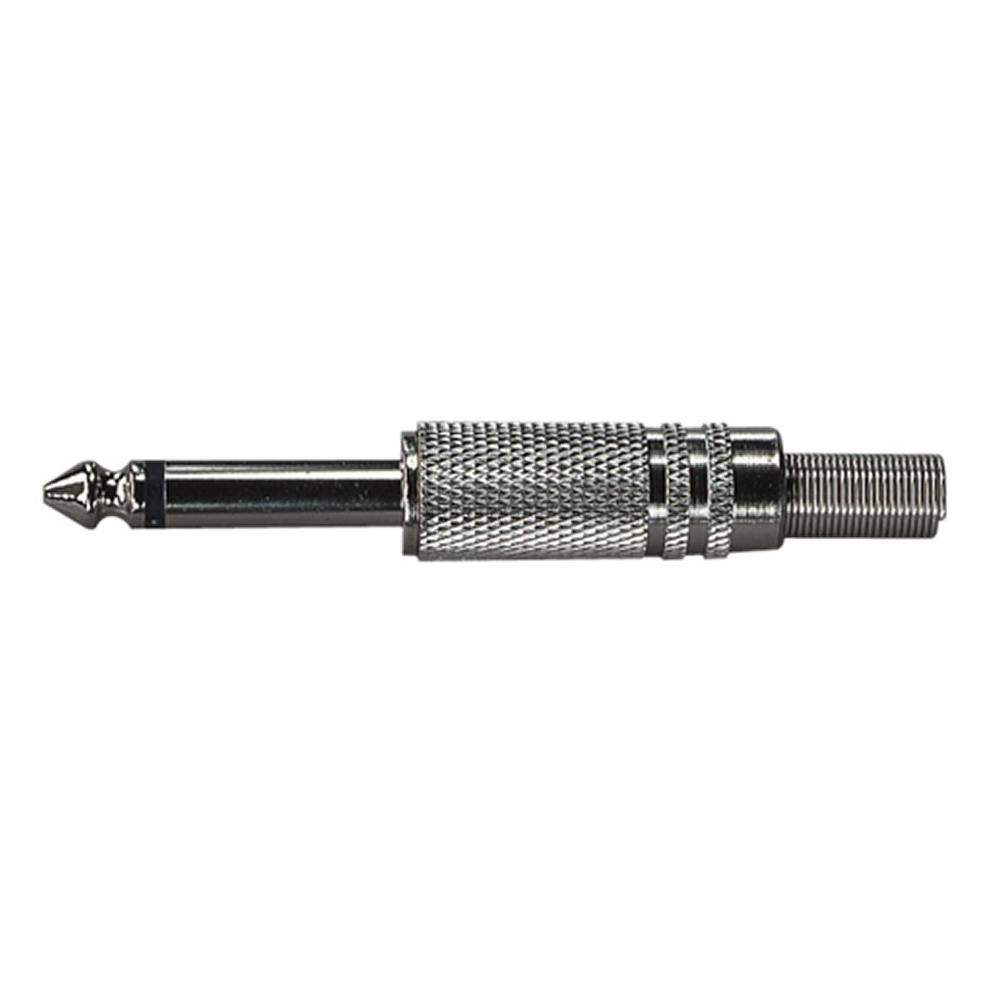 Standard quality. Metal cover with spring cable protector. Solder terminals. Nickel 6.35mm Mono Plug With Spring Cable Protector and Solder Terminals...