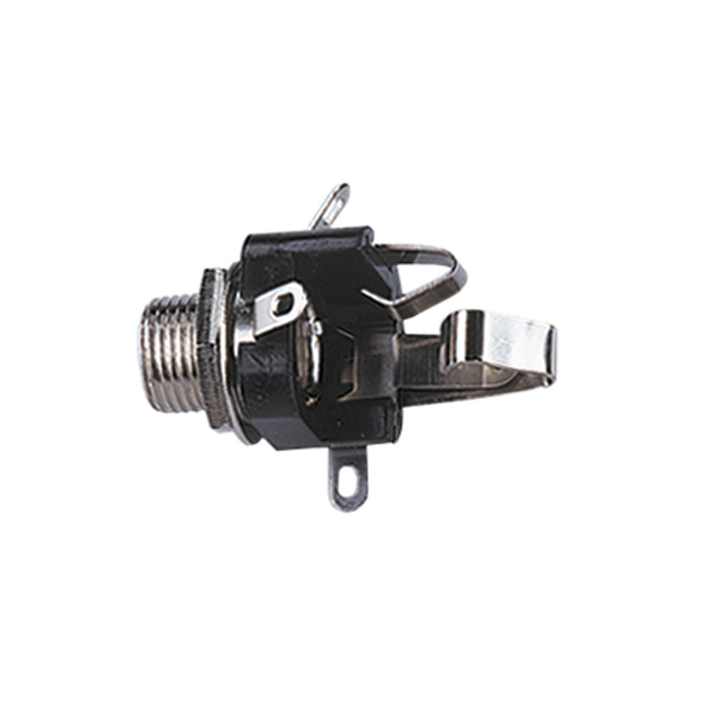 Standard quality. Plastic body. Solder terminals. Nickel 6.35 mm Switched Stereo Chassis Socket with Plastic Body and Solder Terminals...