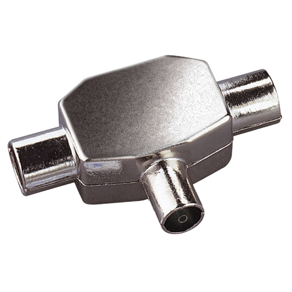 Coaxial T splitter giving two standard coaxial outlets from one single input. Line socket input to 2 coaxial line plug outputs. All metal construction.