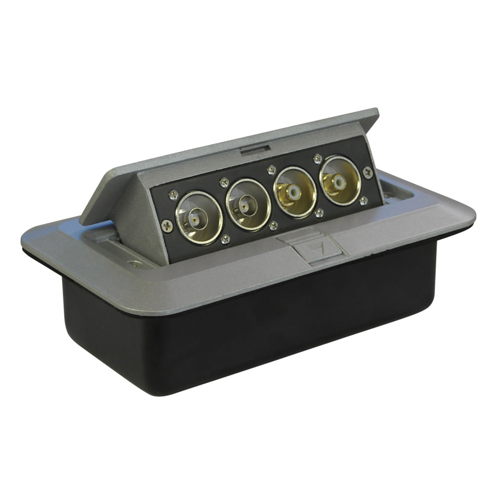 Silver Pop-Up combination AV plate with 2 x BNC connectors and 2 x phono sockets for floor or wall mounting, with metal back box, made from robust materials this product can be used on professional installations for either wall or floor mounting. Comes with a fitted metal back box with knock outs to accept cable.