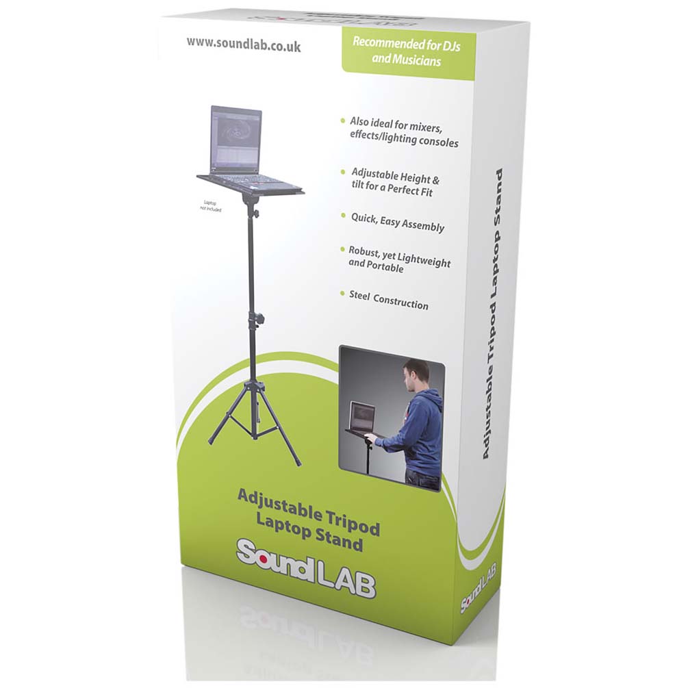 The Portable Tripod Laptop Stand features an adjustable tilt top and overall height adjustment; making for a safer, more comfortable fit. The Laptop Stand is ideal for DJs or Musicians and will hold not only laptops, but also mixers, effects units or lighting consoles, up to a maximum 15 kg weight. Designed to be quick and easy to assemble and transport, the Portable Tripod Laptop Stand is great for mobile or temporary venues and locations, while the sturdy construction makes it durable and robust for everyday use.
