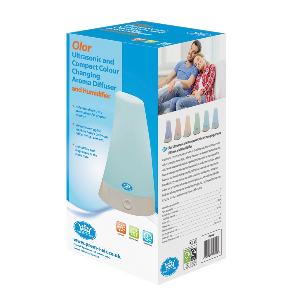 Create your perfect atmosphere with an Olor Ultrasonic Aroma Diffuser with colour changing mood light. Utilising the power of ultrasonic technology this unit combines essential oils (not supplied) and tap water to produces a fine haze of water particles infused with essential oils and comes with the added bonus of a colour changing mood light. The fine haze helps to balance the humidity in dry rooms which can aid in breathing and sleeping, while the subtle use of essential oils and colour changing can calm and relax. Ideal for bedrooms, living rooms and small offices the product is compact and can run for up to 10 hours and has run dry shut off for safety.