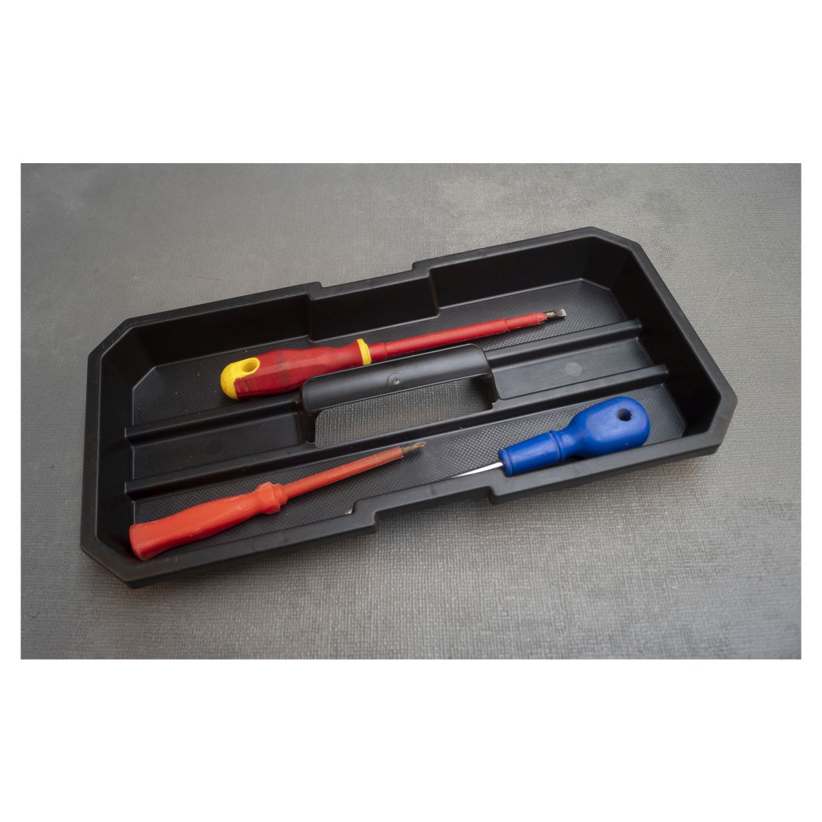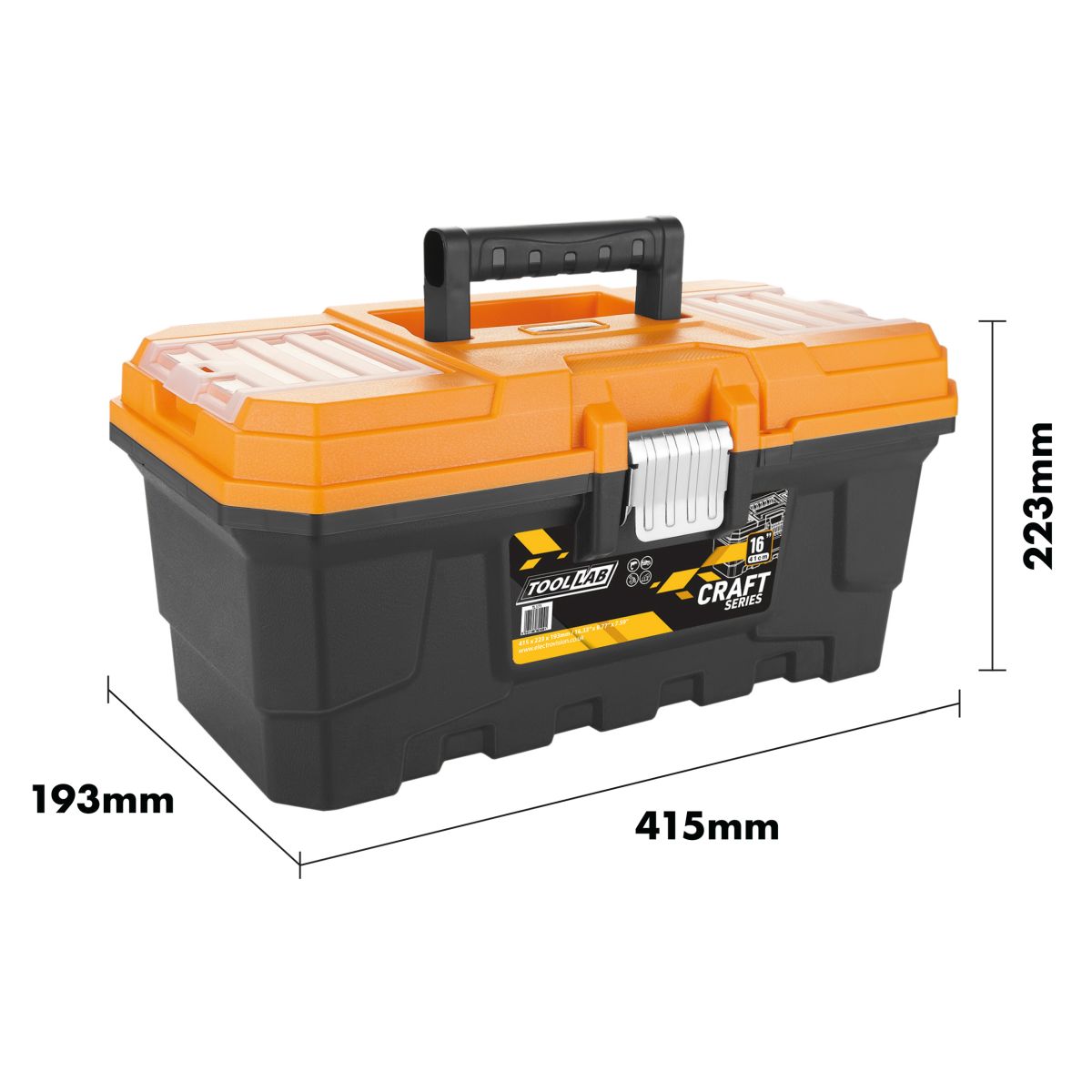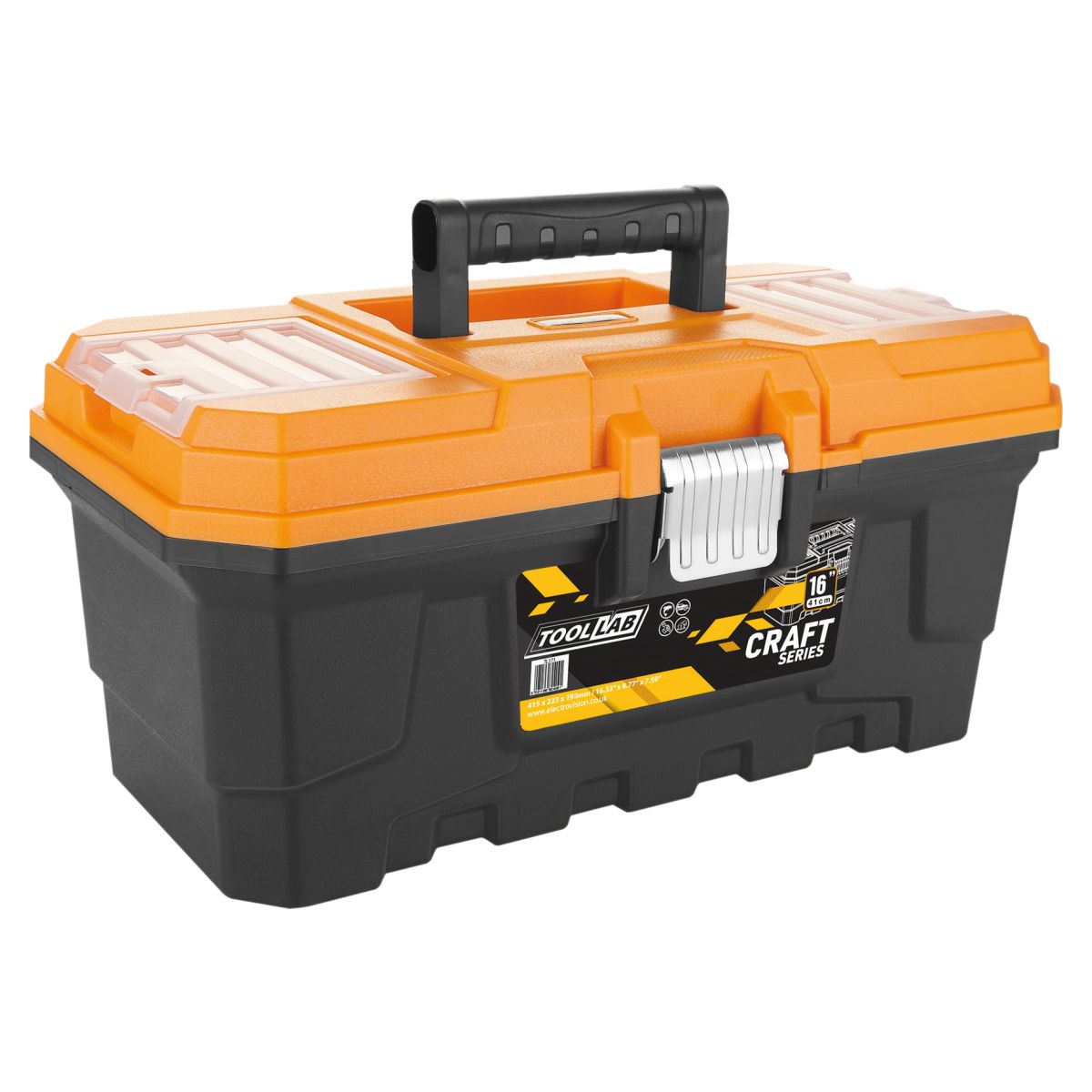 Tool Box with a removable tote tray and 2 storage compartments in the lid. The lid has a heavy duty metal clasp and a sturdy carry handle making itideal for electricians, plumbers, car mechanics or just for use in the home or garage.