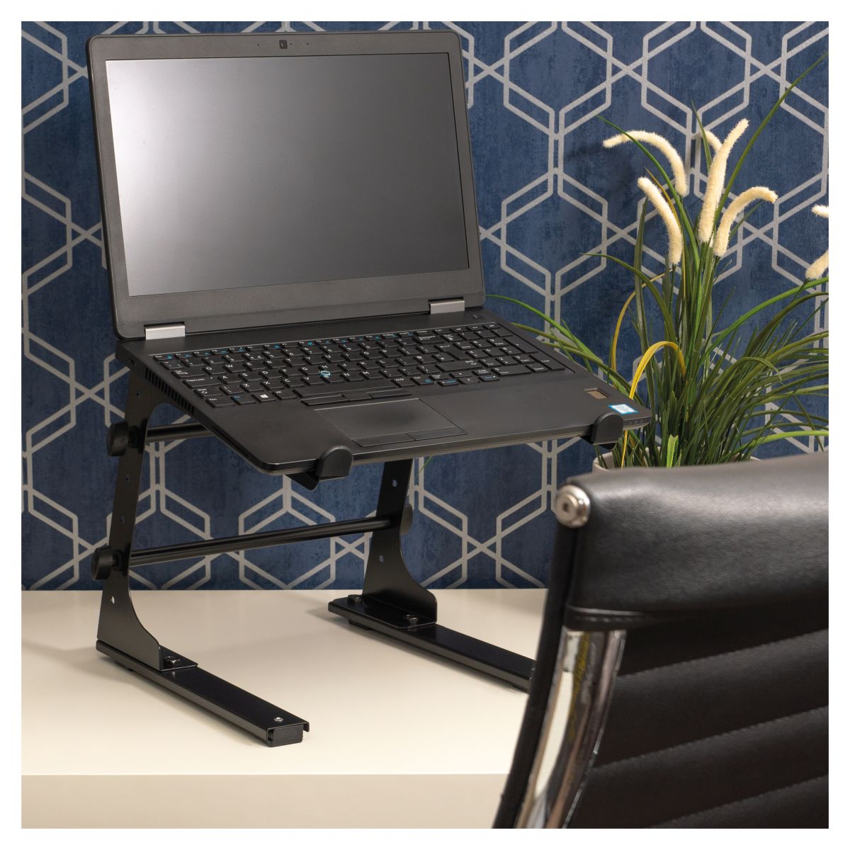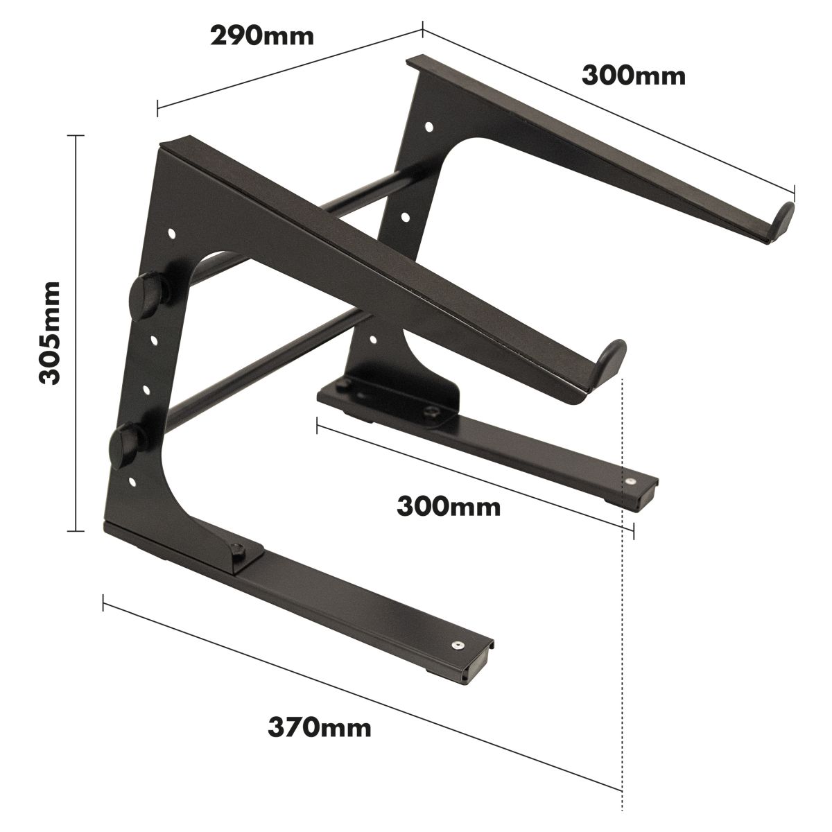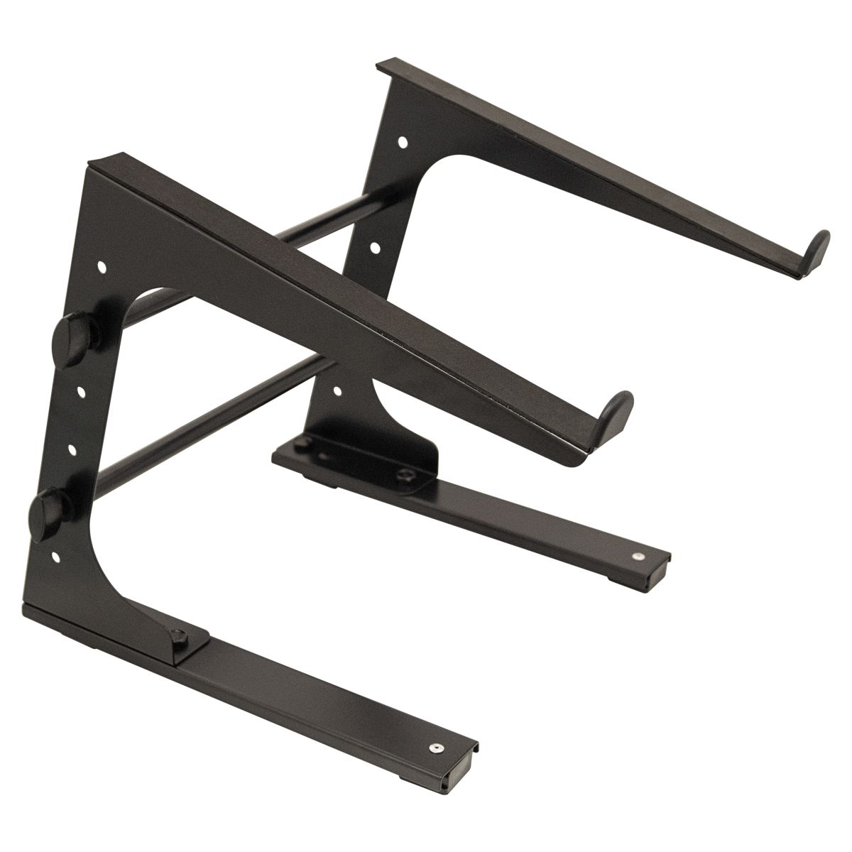 This portable, fixed height, angled laptop stand, is designed to sit on a desk, table or other suitable flat surface. The laptop stand is ideal for DJs or musicians and will safely hold laptops as well as some mixers, effects units or lighting consoles. The arms feature raised lips to prevent the laptop slipping forward and the stand can be assembled quickly and easily.