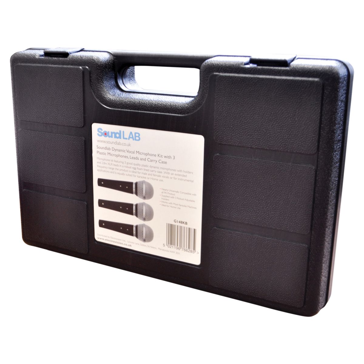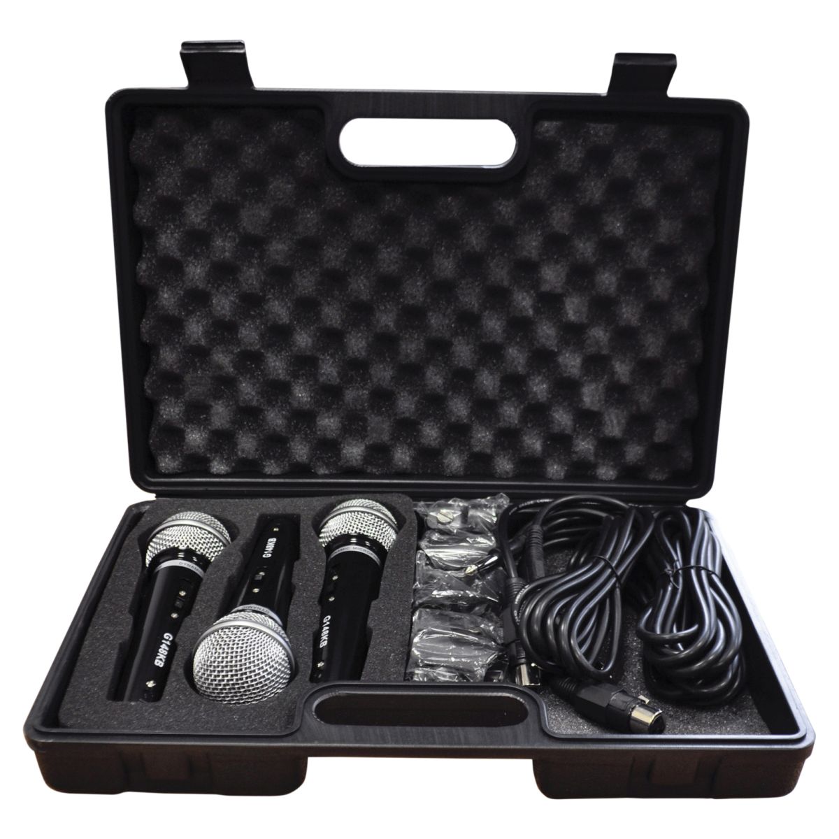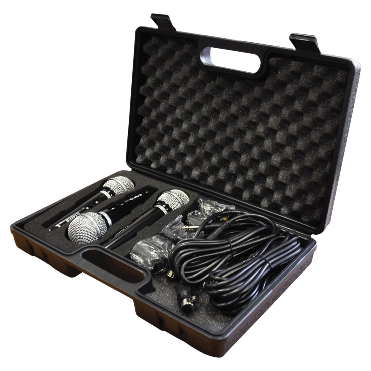 Microphone kit featuring 3 good quality plastic dynamic microphones with holders and 2.8m XLR leads in a robust egg foam lined carry case. With an extended frequency range the product is ideal for male and female vocals or for instrumental applications and is equally suited for karaoke or Home use.