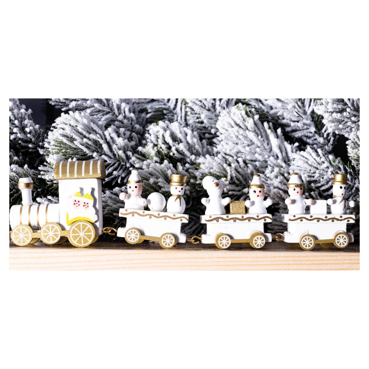 Make Christmas that little bit more special with this beautiful wooden train set, the set consists of an engineand3 carriages all decorated in vibrant and festive colours. The train is adorned with festive figurines such as snowmen, snowballs and presents. Each carriage can be detached and arranged in whatever order you would like. This set would make a thoughtful Christmas gift but would also look great under your Christmas tree or displayed on a coffee table, window sill or fireplace. Made from high quality wood giving it a wonderfully old fashioned feel.