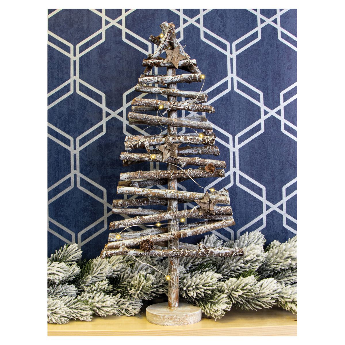 This beautifully crafted wooden Christmas Tree light will look perfect on your window sill or table tops, in fact anywhere you want to create a wonderfully festive atmosphere. The Christmas Tree is made from birch wood and is very rustic in design. The tree is dotted with leaves, stars and pinecones and is wrapped with wire LED string light, when switched on this produces a warm and cosy glow. The lights are battery operated, simply insert 2x AA batteries (not supplied) and enjoy this festive light in the comfort of your own home.