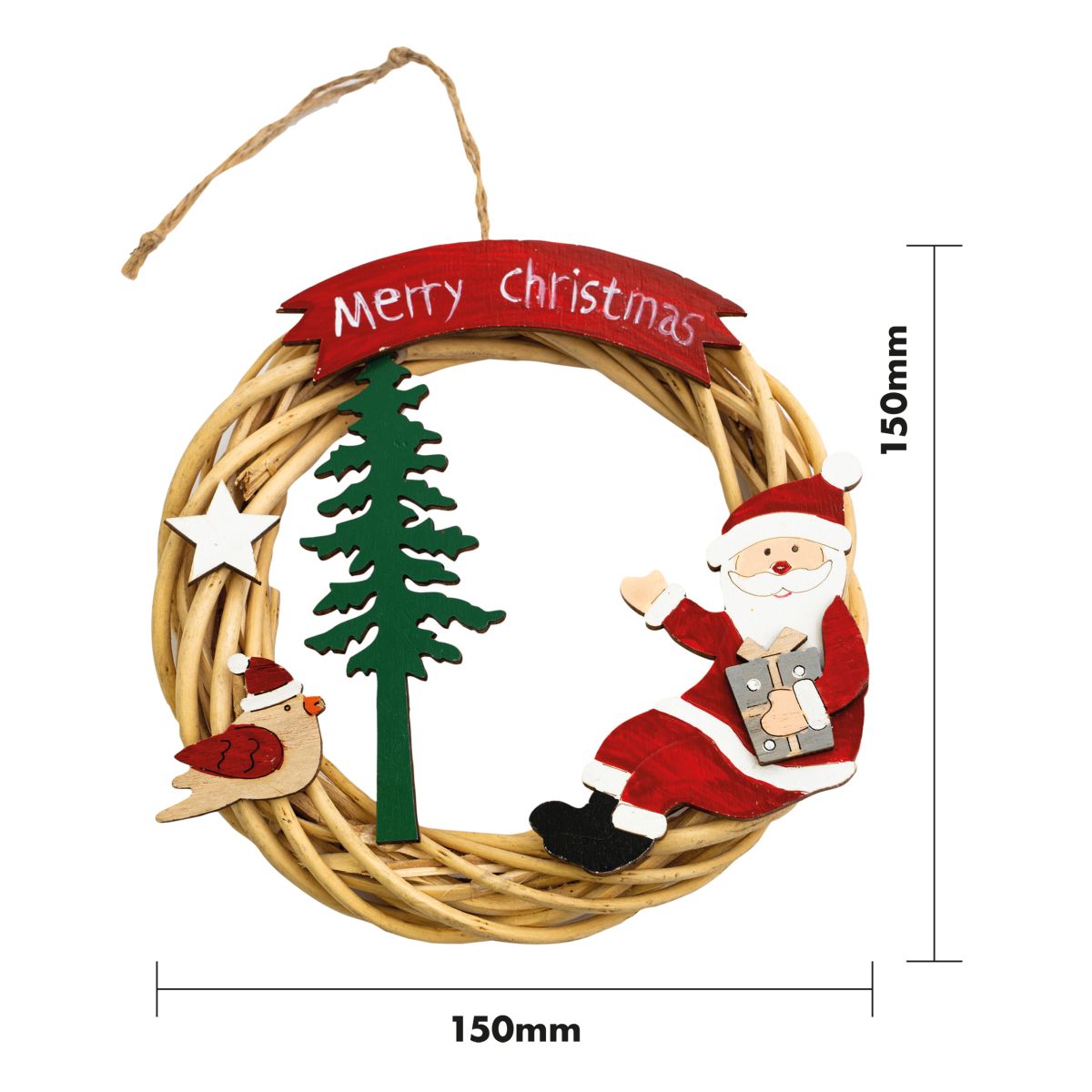 This beautifully crafted wicker Christmas wreath will look perfect on your window sill, table tops or hung on your wall or banister, in fact anywhere you want to create a wonderfully festive atmosphere. The wreath features several wooden figurines including a Snowman, presents, a star and a Christmas tree. Wire LED string light is wrapped around the wreath, when switched on this produces a warm and cosy glow. The lights are battery operated, simply insert 2x AA batteries (not supplied) and enjoy this festive wreath in the comfort of your own home.