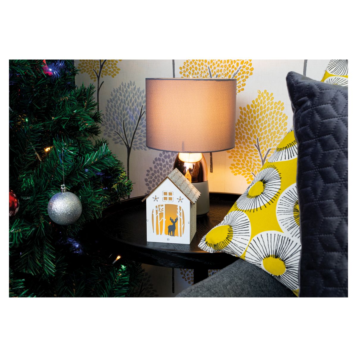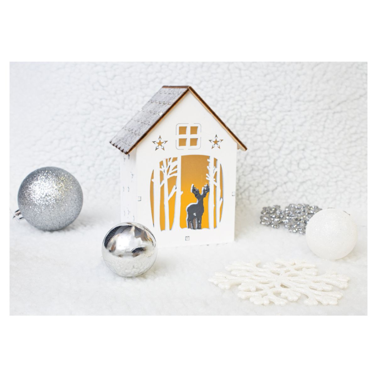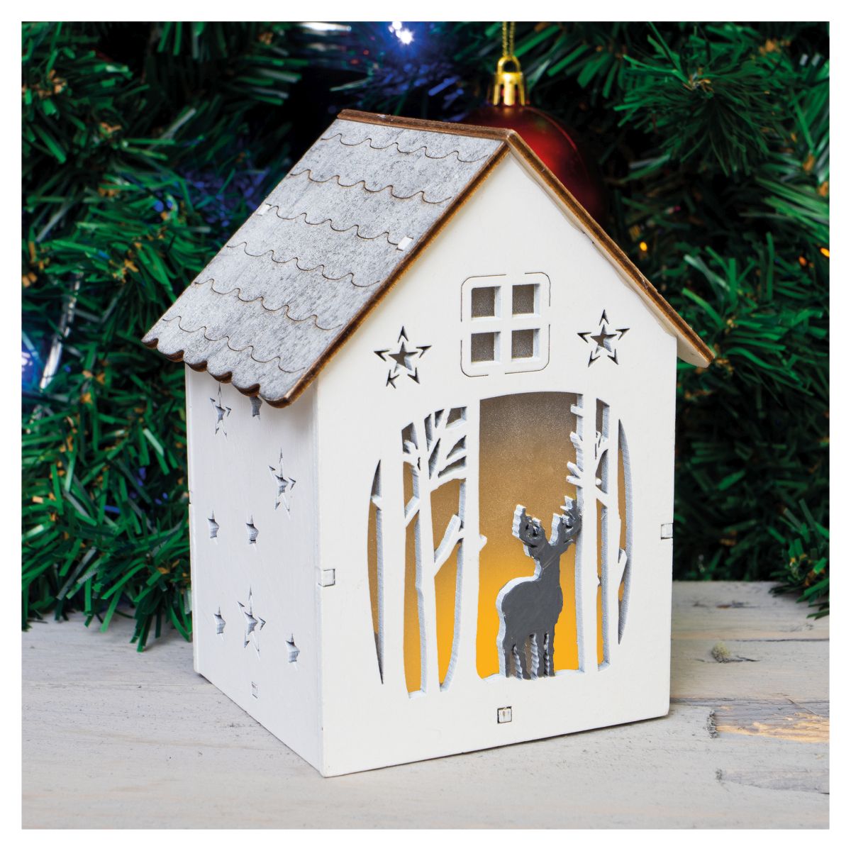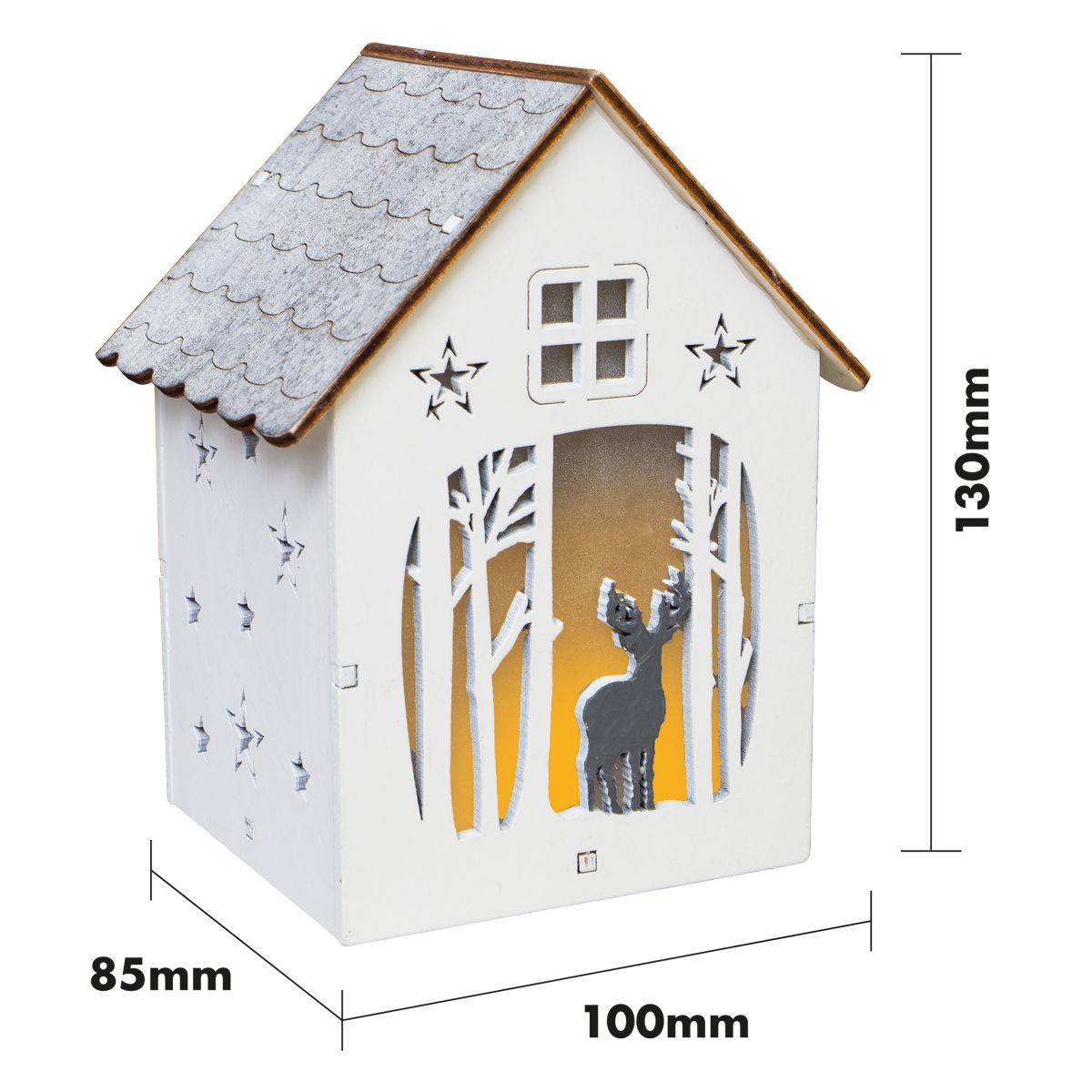 This beautifully crafted light up festive scene will look perfect on your window sill or table tops, in fact anywhere you want to create a wonderfully festive atmosphere. This festive scene is a fantastic alternative to the traditional Christmas candle bridges. The scene features festive carvings of reindeers, Christmas trees and stars and is presented in the shape of a quaint house. The light is placed inside the house and shines through the carvings to create festive silhouettes .The scene is battery operated by 1x CR2032 battery (not supplied) and enjoy this festive light in the comfort of your own home.
