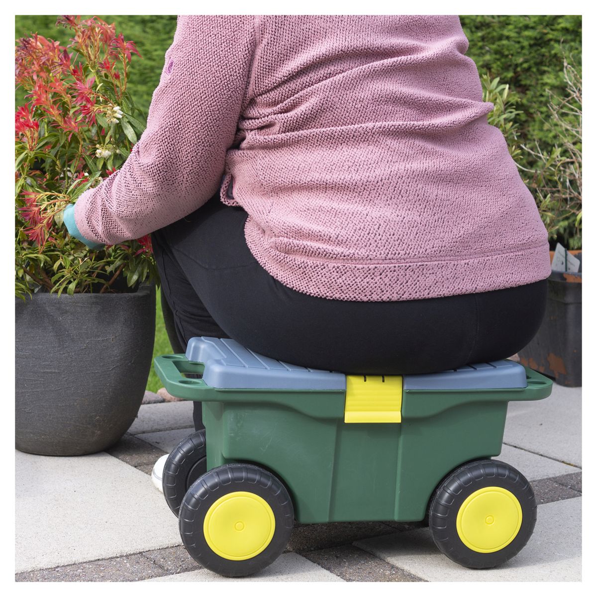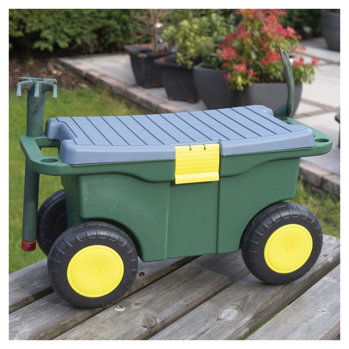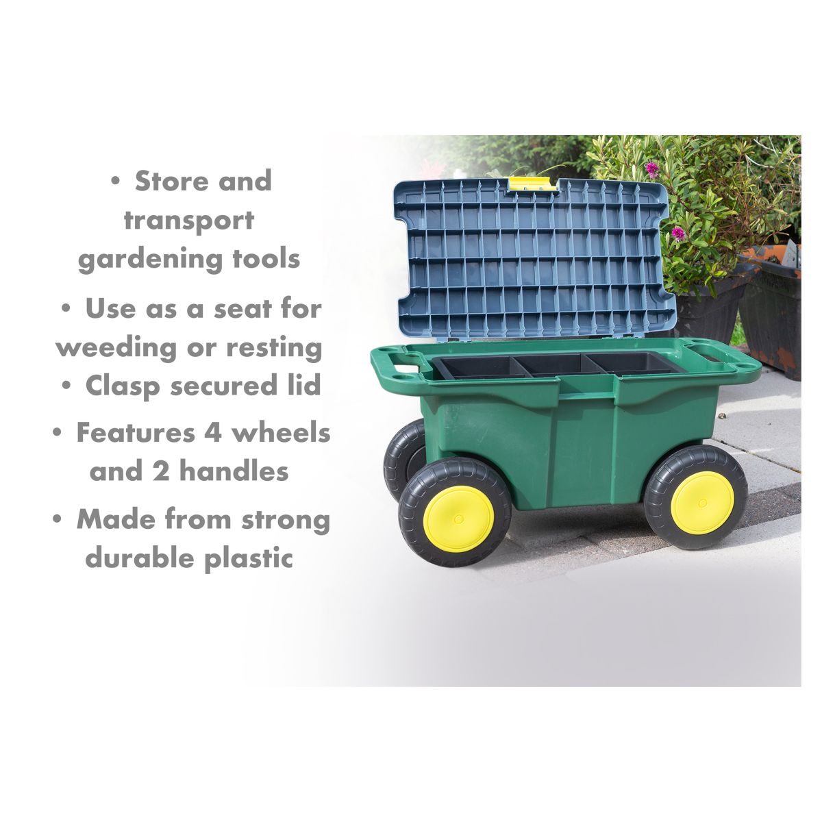 This multi use garden trolley from St Helens Home and Garden is super handy. There is a large compartment under the seat to store tools and supplies such as trowels, gardening gloves and string. There is also a removeable tray which is perfect for storing items such as seeds and plant labels. The trolley has 4 wheels and 2 handles making it easy to move your tools around the garden. Sit on the sturdy seat when you are weeding or just when you feel like a rest and want to admire your handiwork. Made from strong plastic to ensure many years of use.