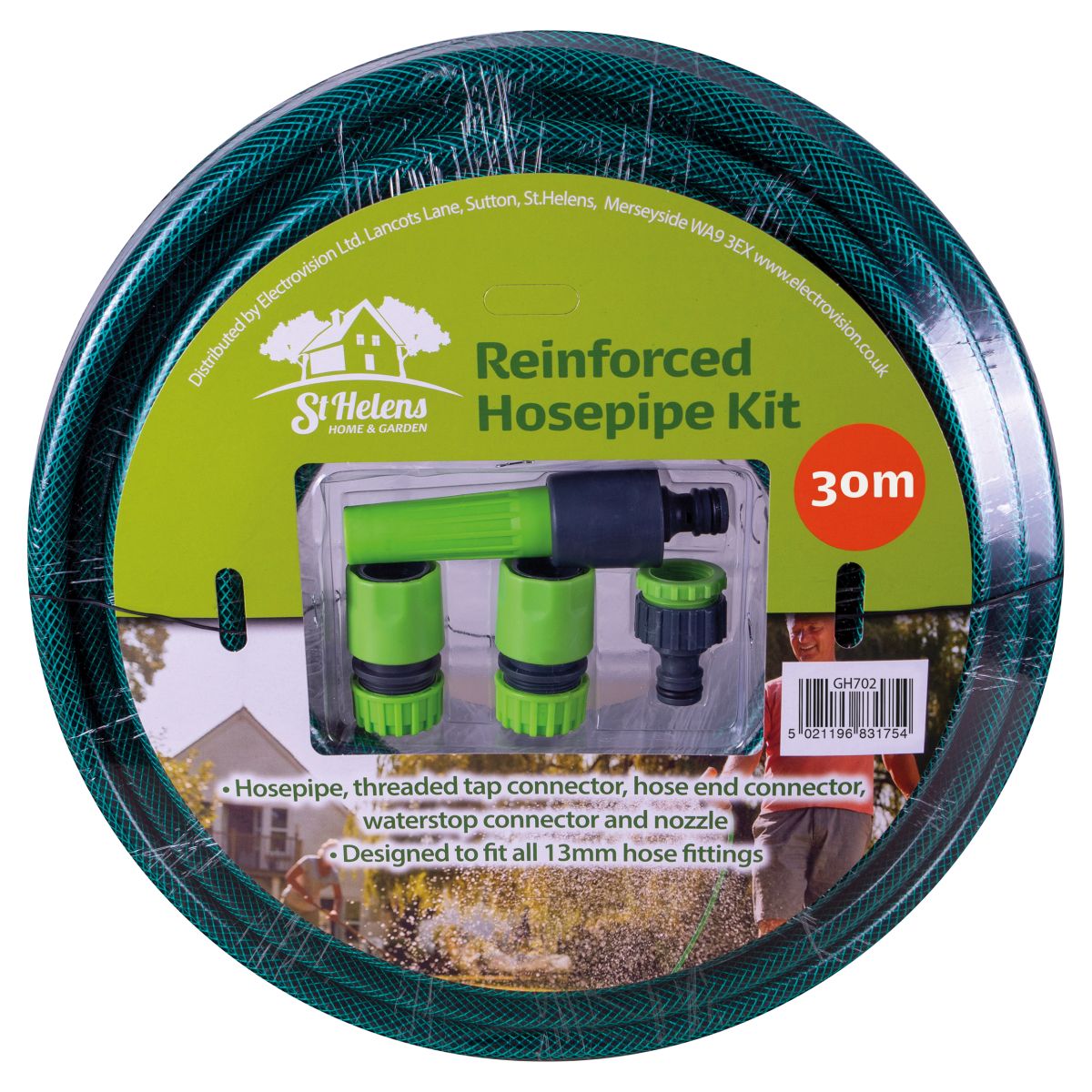 A hosepipe kit consisting of a length of reinforced hosepipe, a threaded indoor/outdoor tap connector, a hose end connector, a waterstop connector and a nozzle sprayer. The hosepipe is designed to fit all 13mm hose fittings. Ideal for watering your garden, washing your car andbathing pets etc. The hose pipe is reinforced to guarantee flexibility and strength. The kit is available with various lengths of hose, choose the hose length that suits the size of your garden.