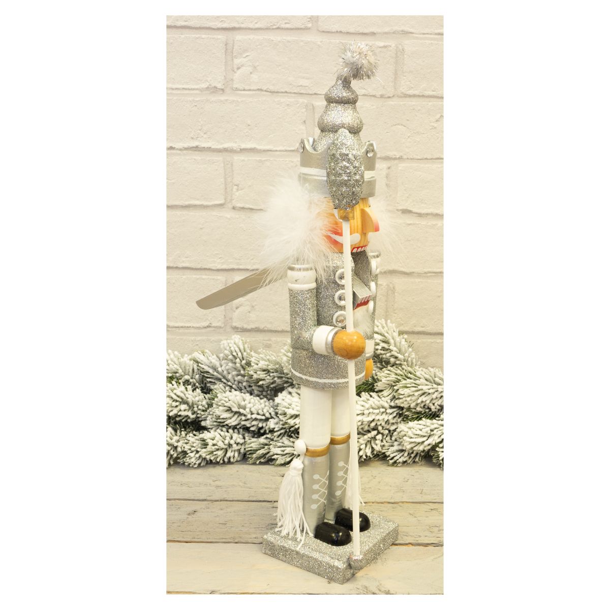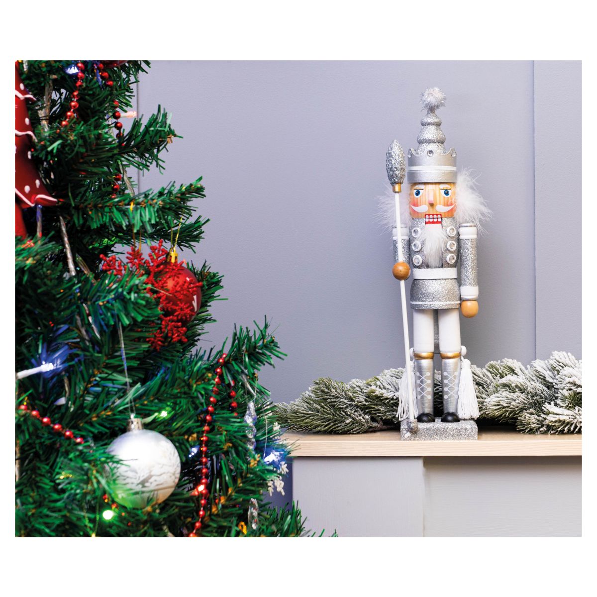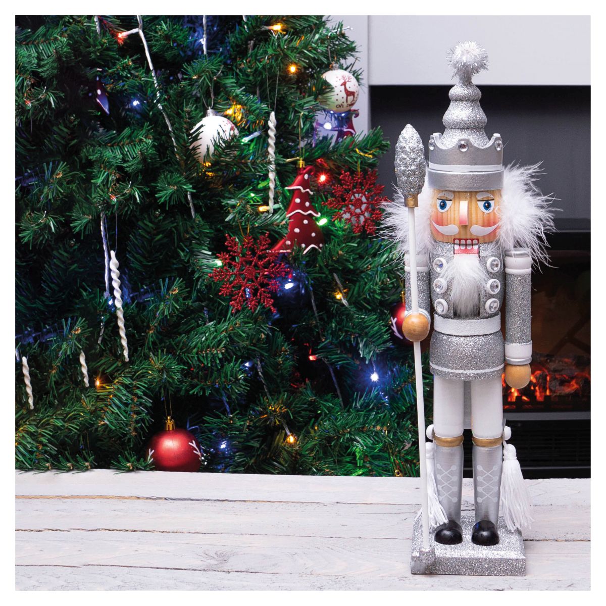 Add a touch of class to your Christmas decorations this year with this beautiful vibrantly coloured nutcracker decoration. The silver and white uniform is very festive and particularly eye catching in the delicate twinkling lights of your Christmas tree thanks to the silver glitter detailing. In German tradition nutcrackers are symbols of good luck and ward off evil spirits serving as protectors of your home. The nutcracker stands flat so it can be placed on window ledges, fireplaces or coffee tables, the perfect Christmas ornament.