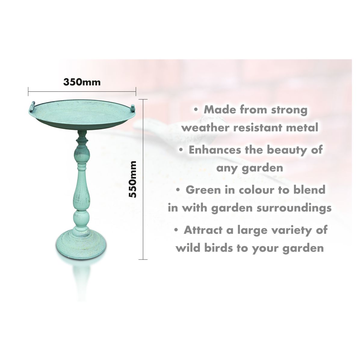 This ornamental pedestal bird bath from St Helens Home and Garden will enhance the beauty of any garden and attract a large variety of wild birds all year round. The bath is a beautiful green colour meaning it will blend in seamlessly with your garden surroundings. Made from strong and durable, weather resistant metal giving you many years of use. The bird bath is freestanding so simply place in a prominent position in your garden and watch the wild birds as they come and go.