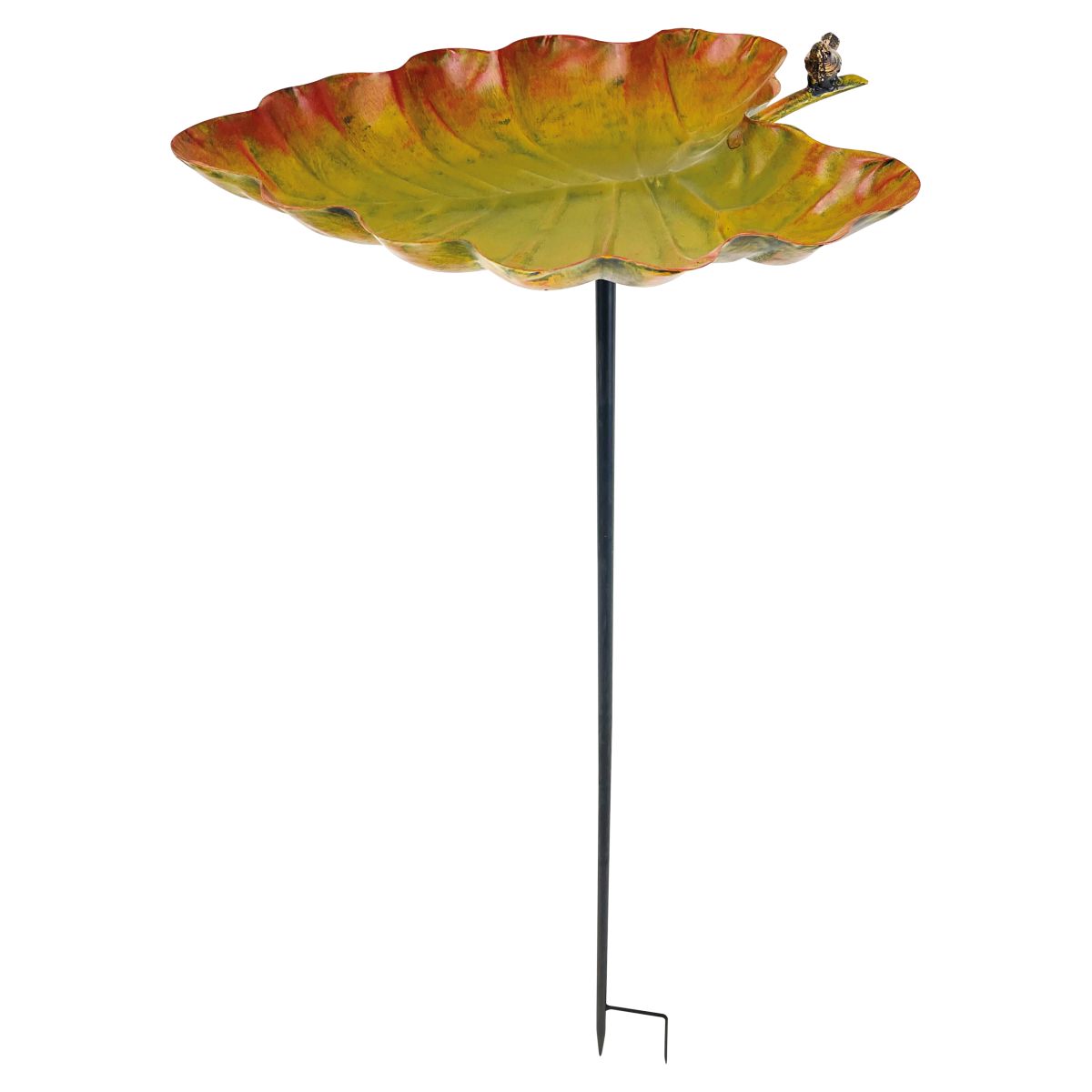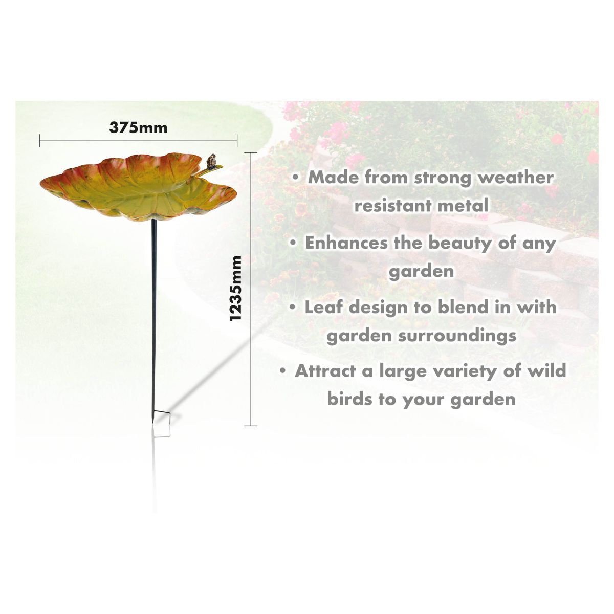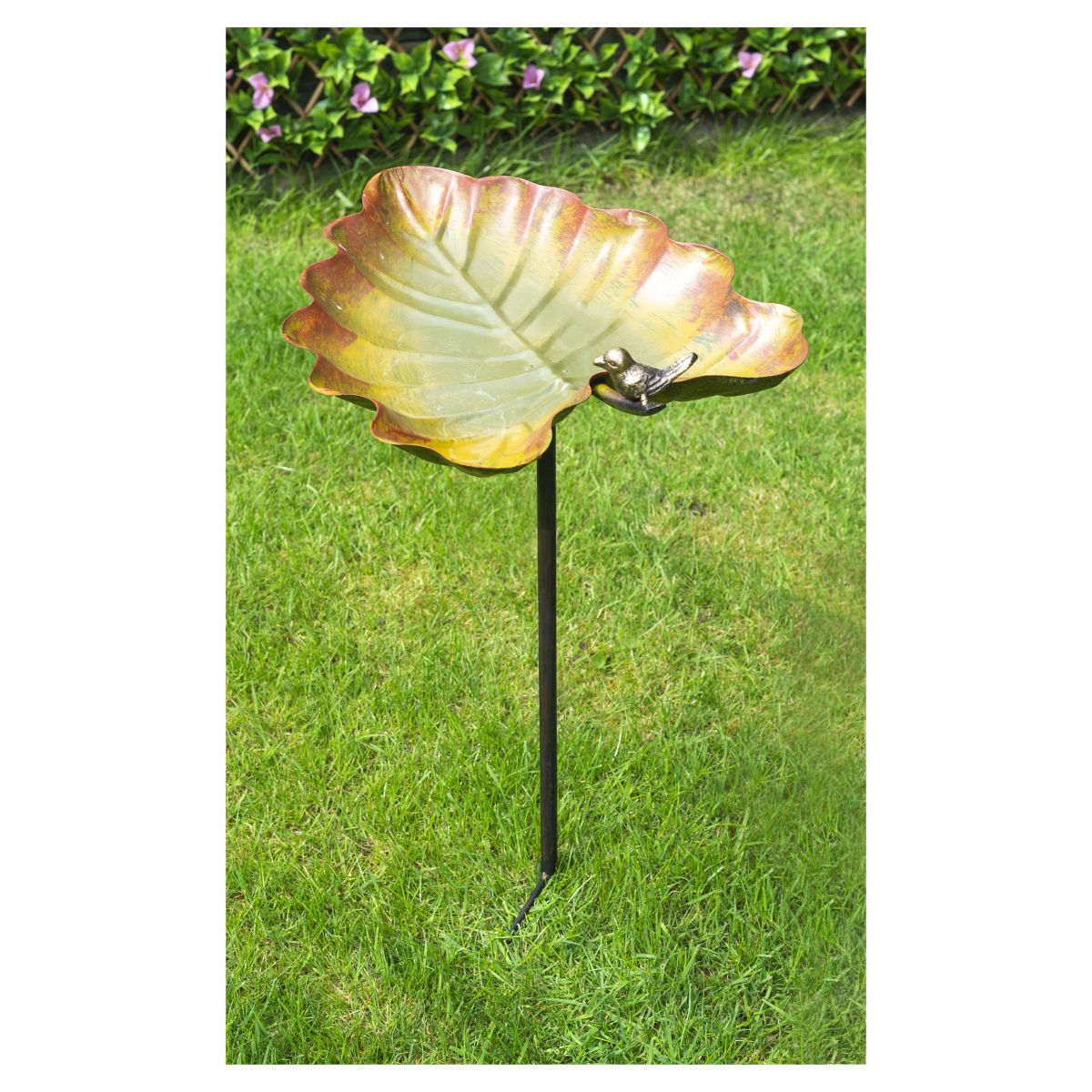 This ornamental bird bath from St Helens Home and Garden will enhance the beauty of any garden and attract a large variety of wild birds all year round. The bath is designed to look like a beautiful leaf meaning it will blend in seamlessly with your garden surroundings. Made from strong and durable, weather resistant metal giving you many years of use. The bird bath is freestanding so simply place in a prominent position in your garden using the ground spikes and watch the wild birds as they come and go.