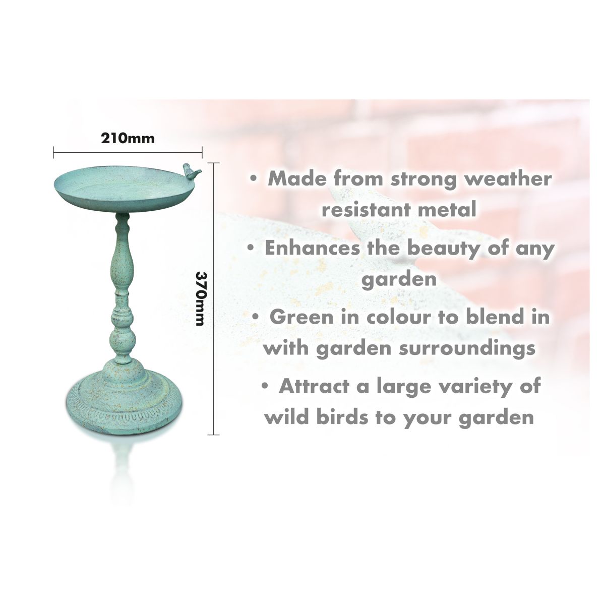 This ornamental pedestal bird bath from St Helens Home & Garden, will enhance the beauty of any garden and attract a large variety of wild birds all year round. The bath is a beautiful green colour meaning it will blend in seamlessly with your garden surroundings. Made from strong and durable, weather resistant metal giving you many years of use. The bird bath is freestanding so simply place in a prominent position in your garden and watch the wild birds as they come and go.