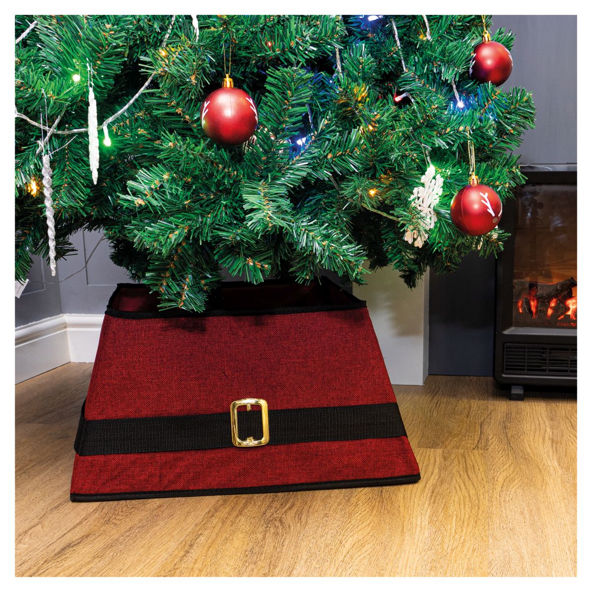 Forget the star on top, this tree skirt is a must to finish off your Christmas tree. No unsightly legs, trunk or stand, the skirt hides the base of your tree and at the same time adds a little fun thanks to its quirky santas belt design. Thanks to the hook and loop fastening the tree skirt is easy to erect and will fold flat for storage when not in use. Use it year after year.